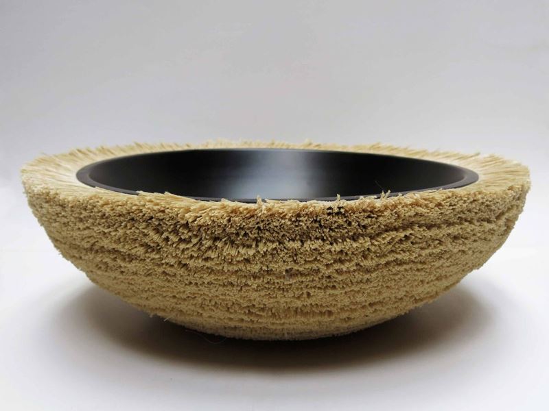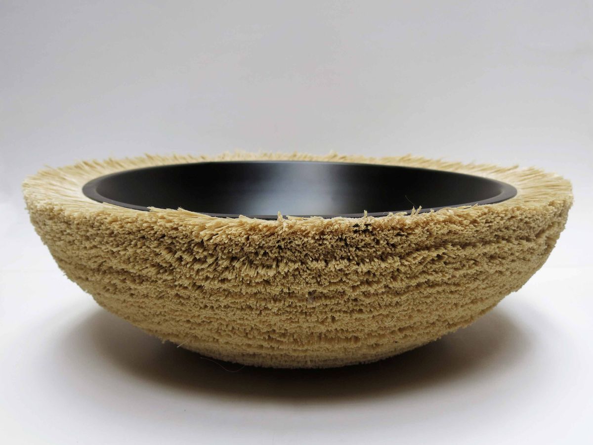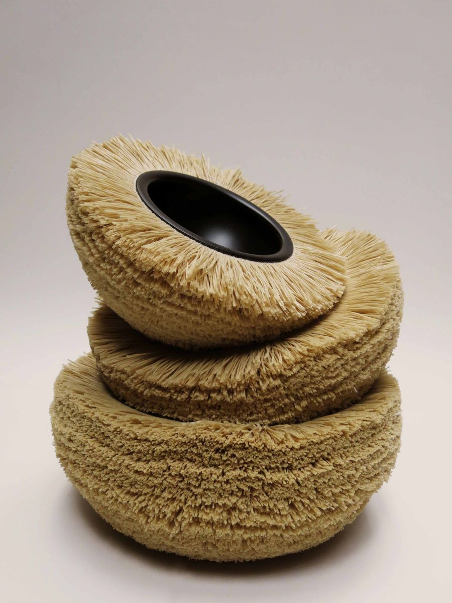 ‘Ninho’—nest in portuguese—a limited edition of bowls, tables and mirrors that have its outer surface covered in the nylon material discarded from carpet edges. the overlapping layers result in volumes that seem to grow around the object. Used a discarded part of a massive production industry to transform it into an object of contemplation that becomes a material provocation to the sense.