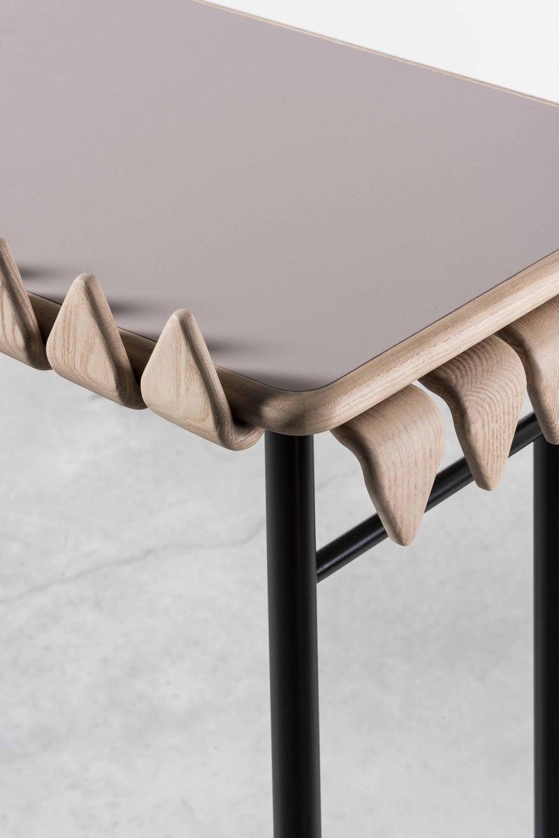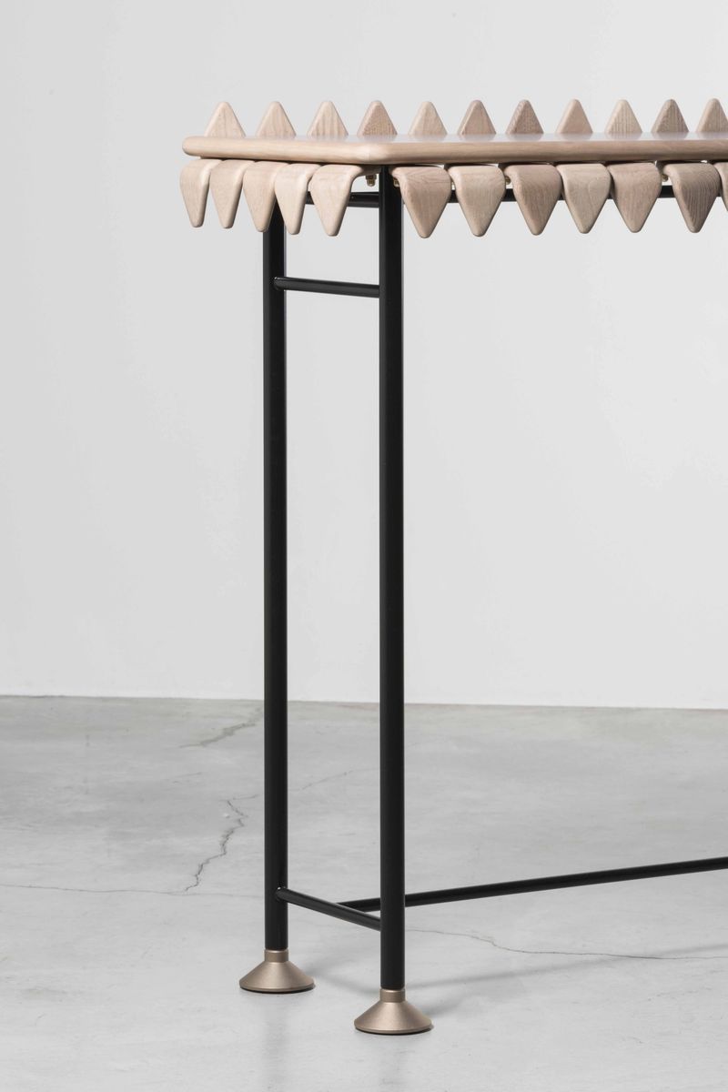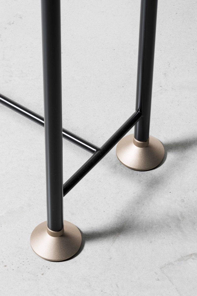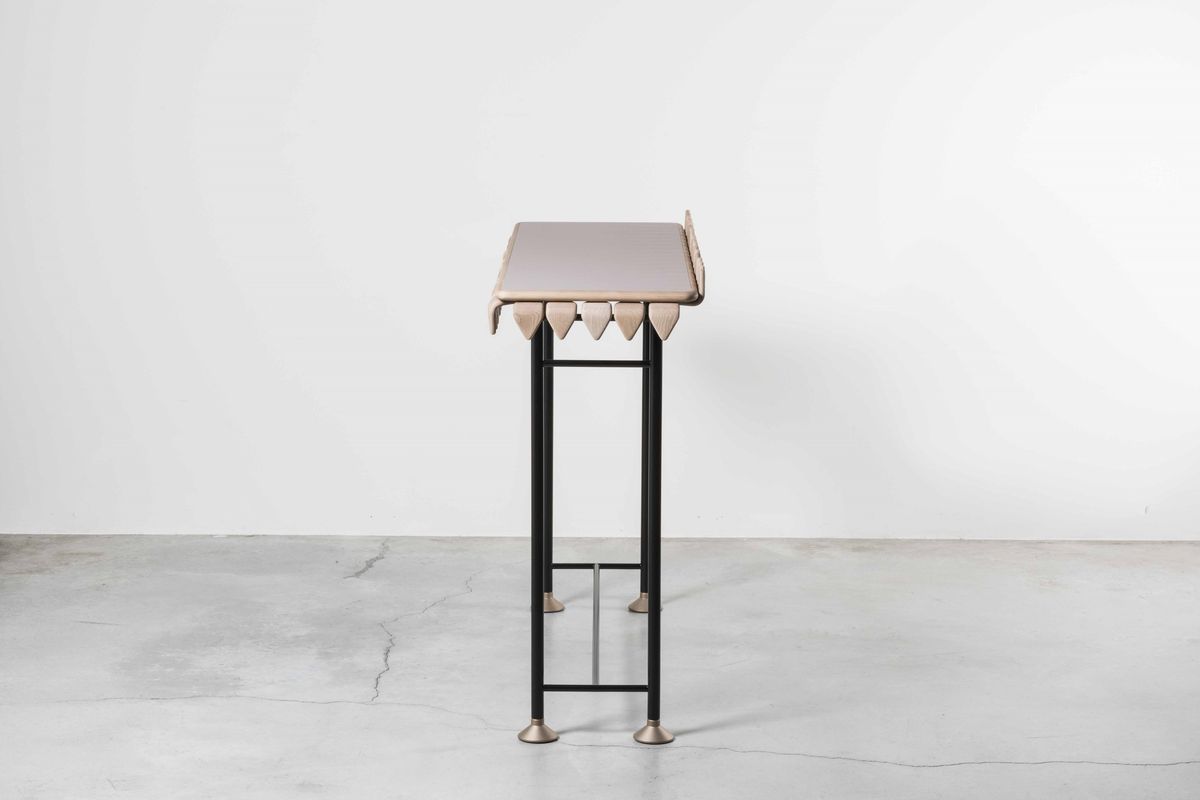 Pink laminated top, american ashwood frame, black semi polished coated metal structure, casted sandblasted bronze feet