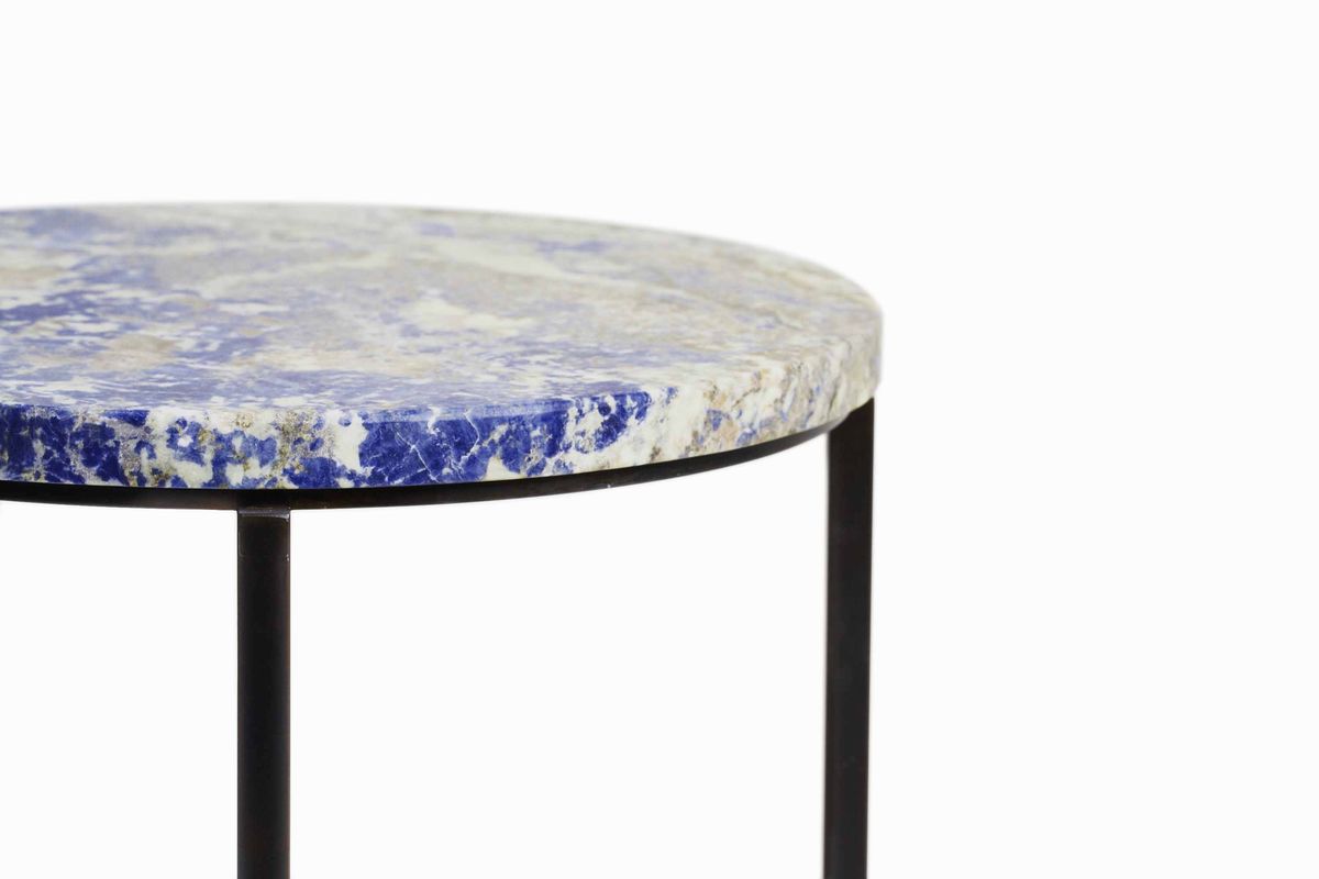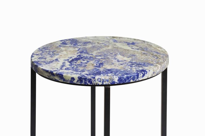 Table in burnished iron, marble Blue Inca, enamel painting