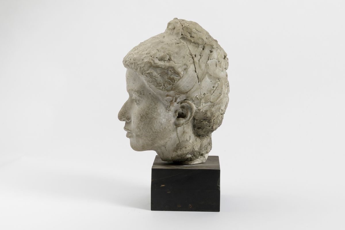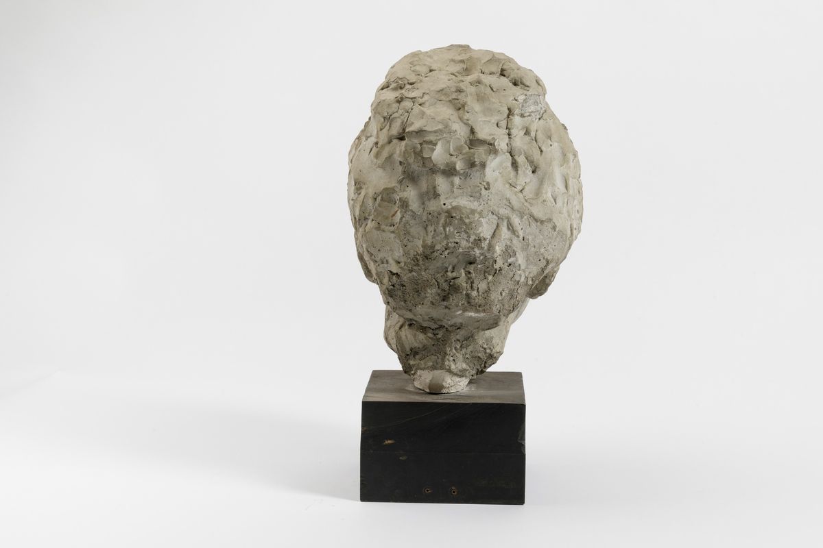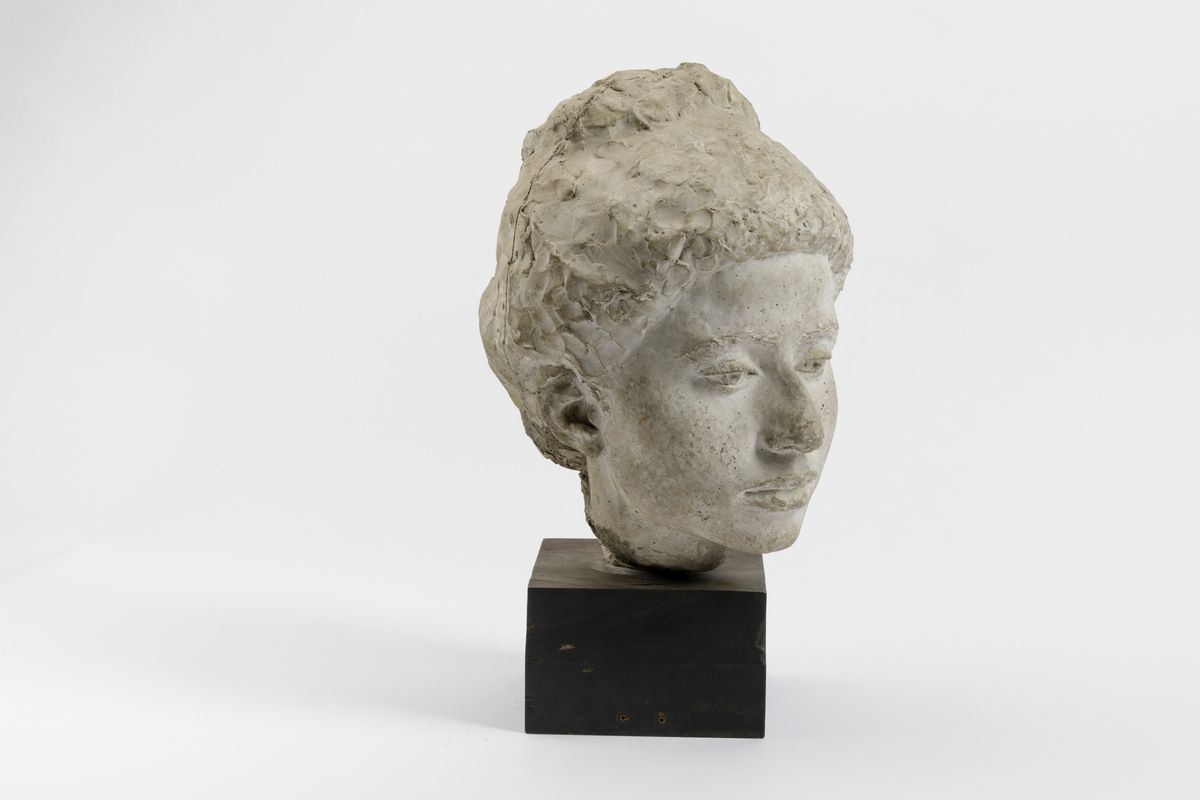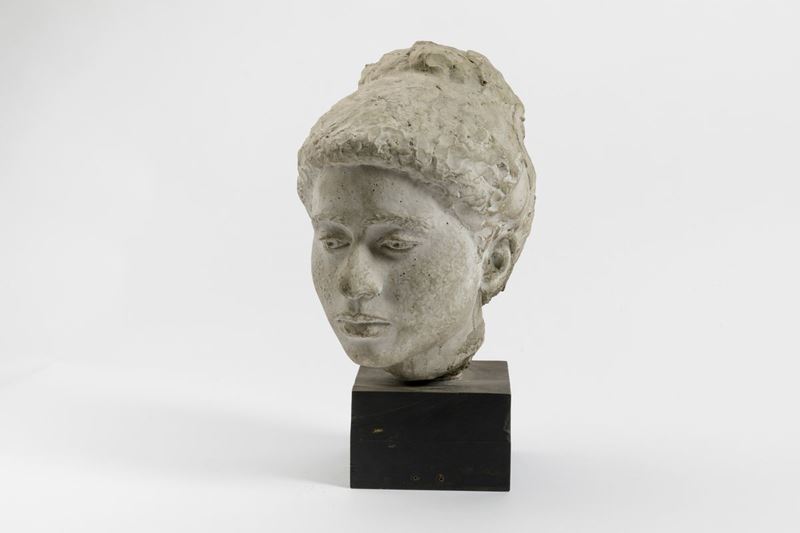 Scultura raffigurante testa di ragazza in cemento, cm 32, con basamento cm 42