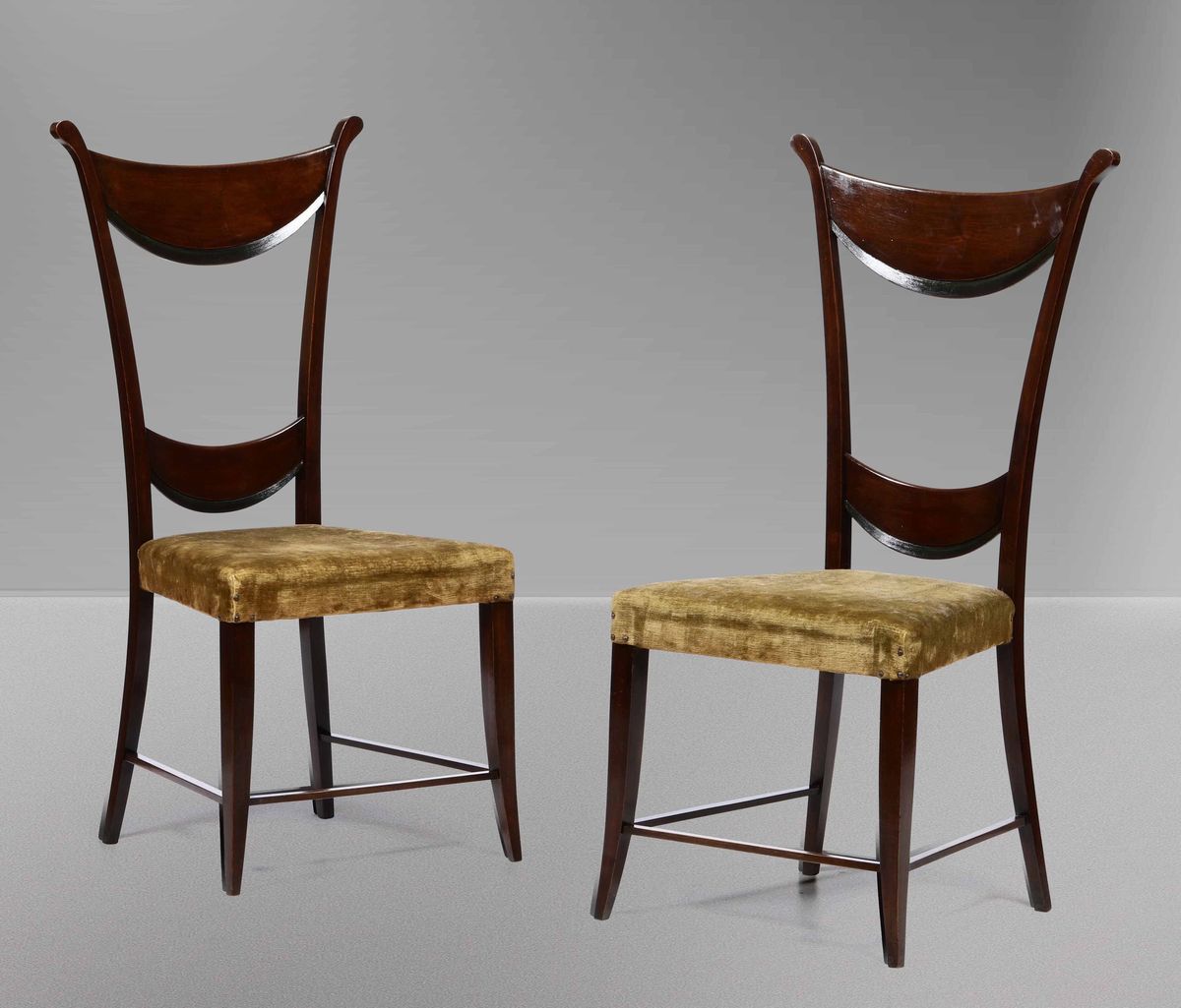 Due sedie con struttura in legno e seduta con rivestimento in tessuto.