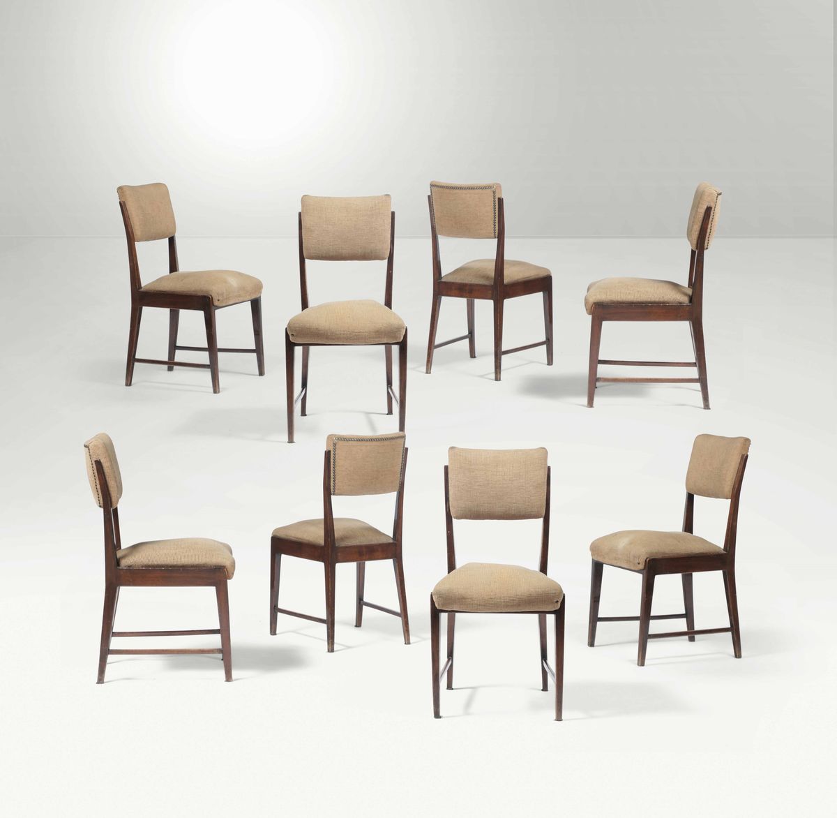 Eight chairs with a wooden structure and fabric upholstery. Italy, 1950 ca.