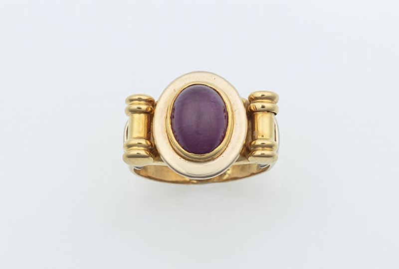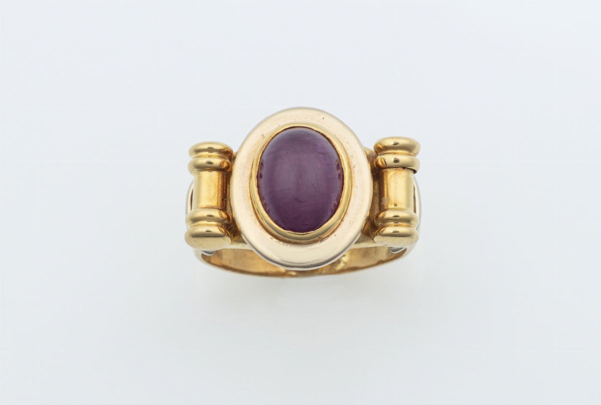 Lotto composto da anello con rubino cabochon ed un paio di orecchini