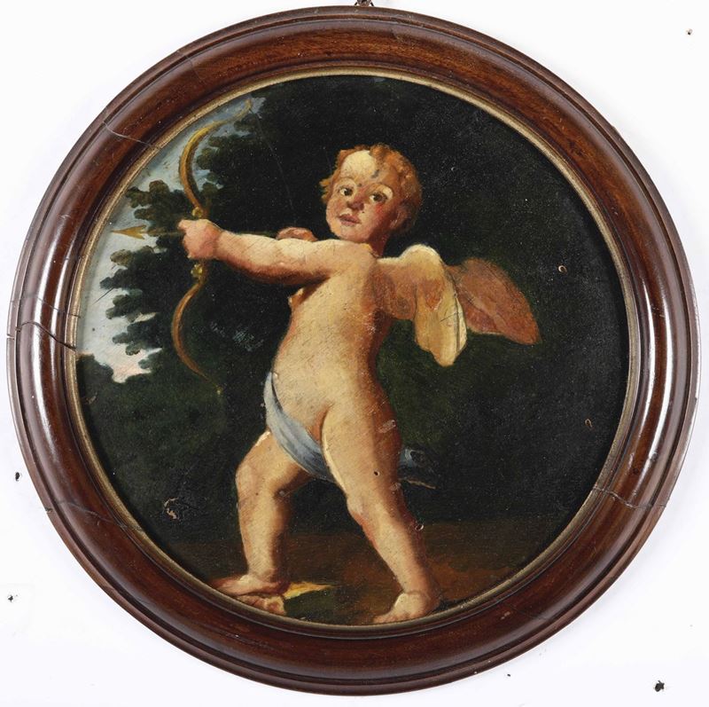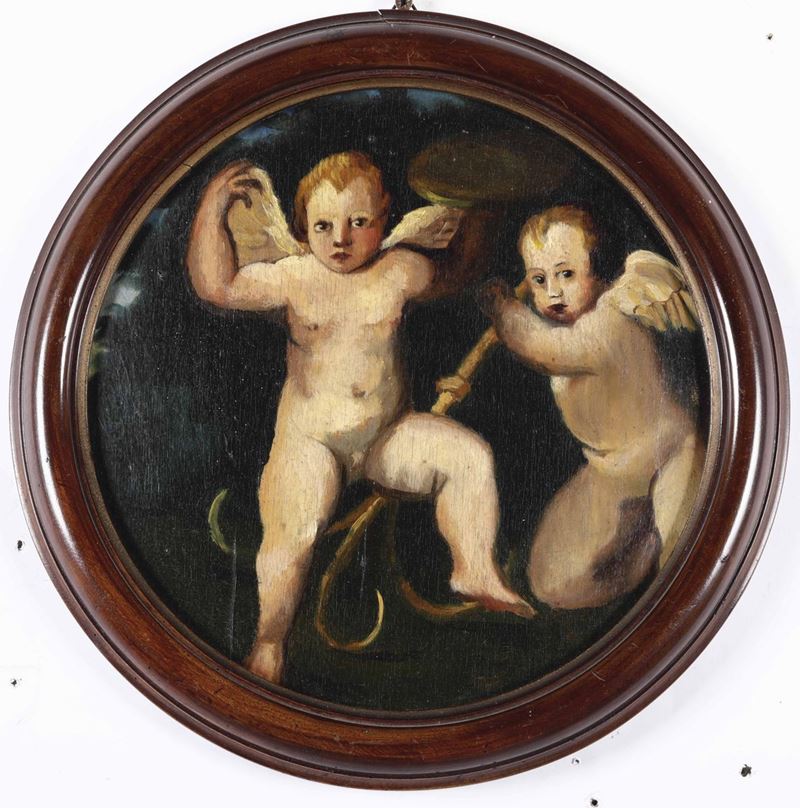 coppia di dipinti ad olio su tavoletta, diam cm 26,5