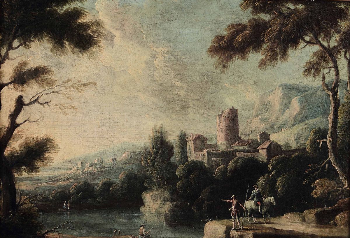 Scuola del XVIII secolo Paesaggio fluviale con figure