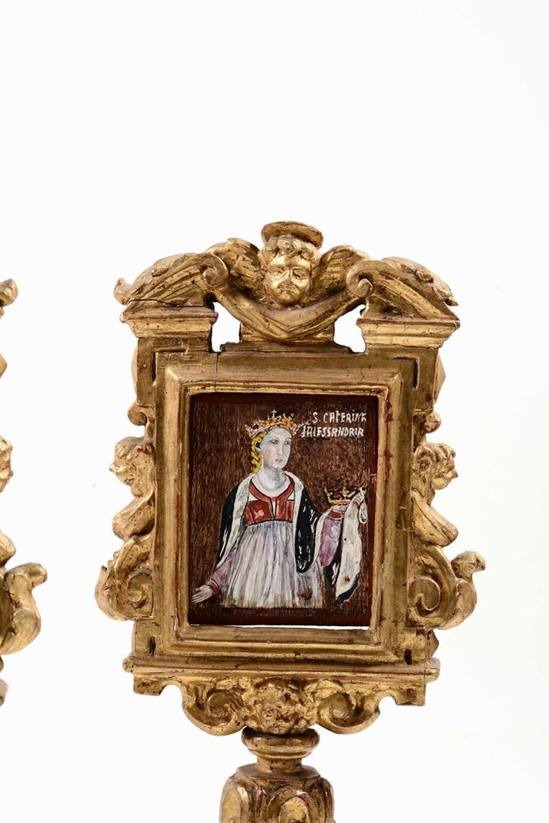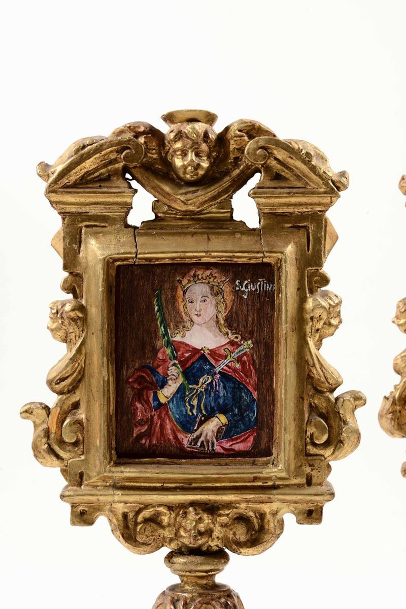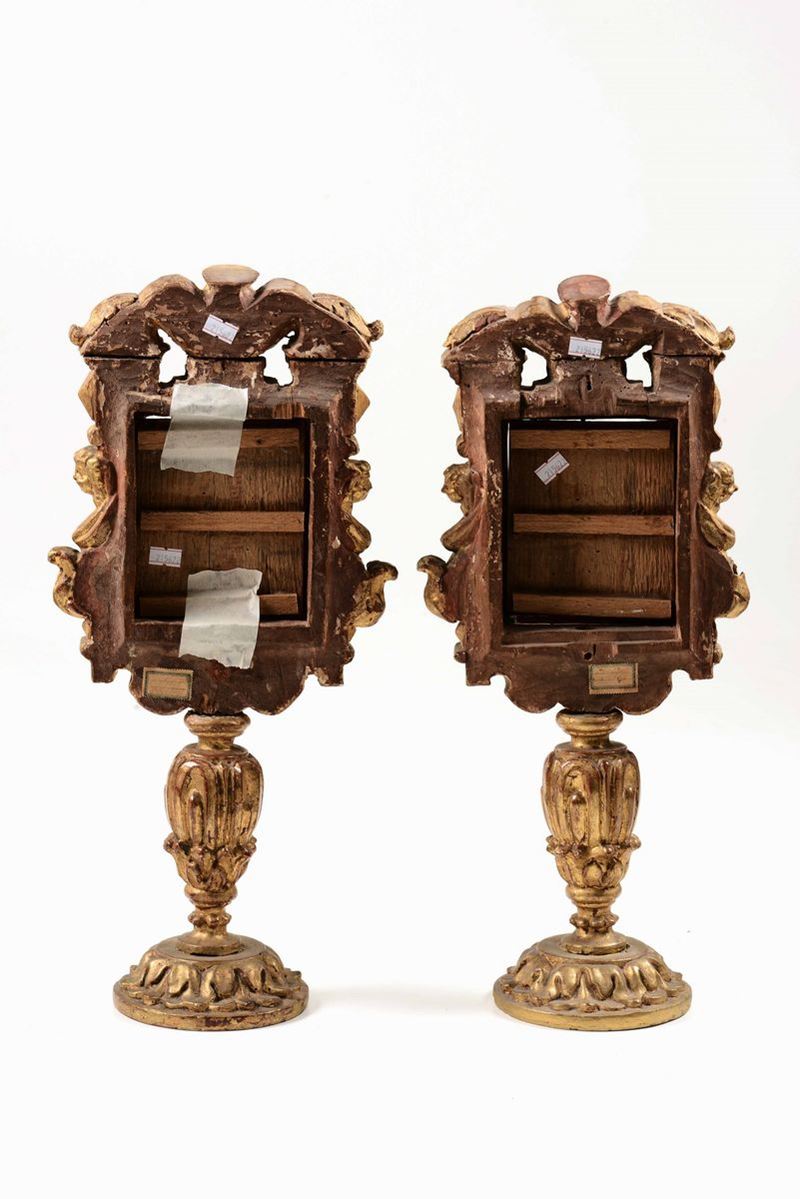 Coppia di ostensori in legno intagliato, dorato e dipinto. Italia centrale, XIX secolo
