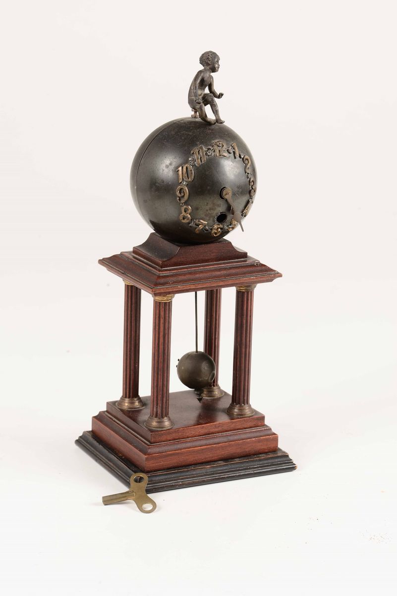 quadrante globulare in metallo sormontato da figura di puttino, altezza cm 33