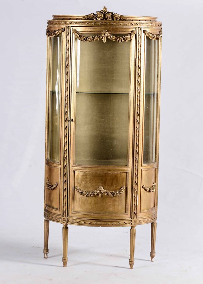 composto da divano, console con specchiera, due poltrone, tre sedie, vetrina, tavolo e trespolo reggi vaso