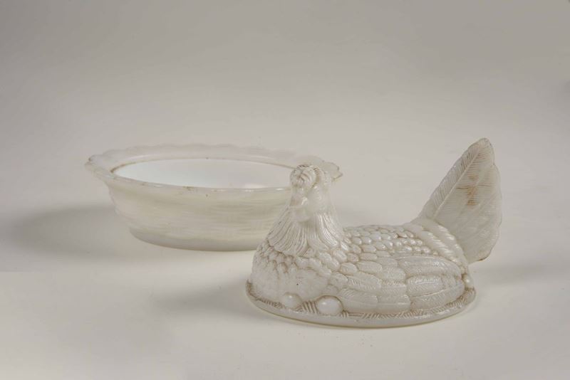 Scatola con coperchio in vetro opalino a forma di gallina su un canestro