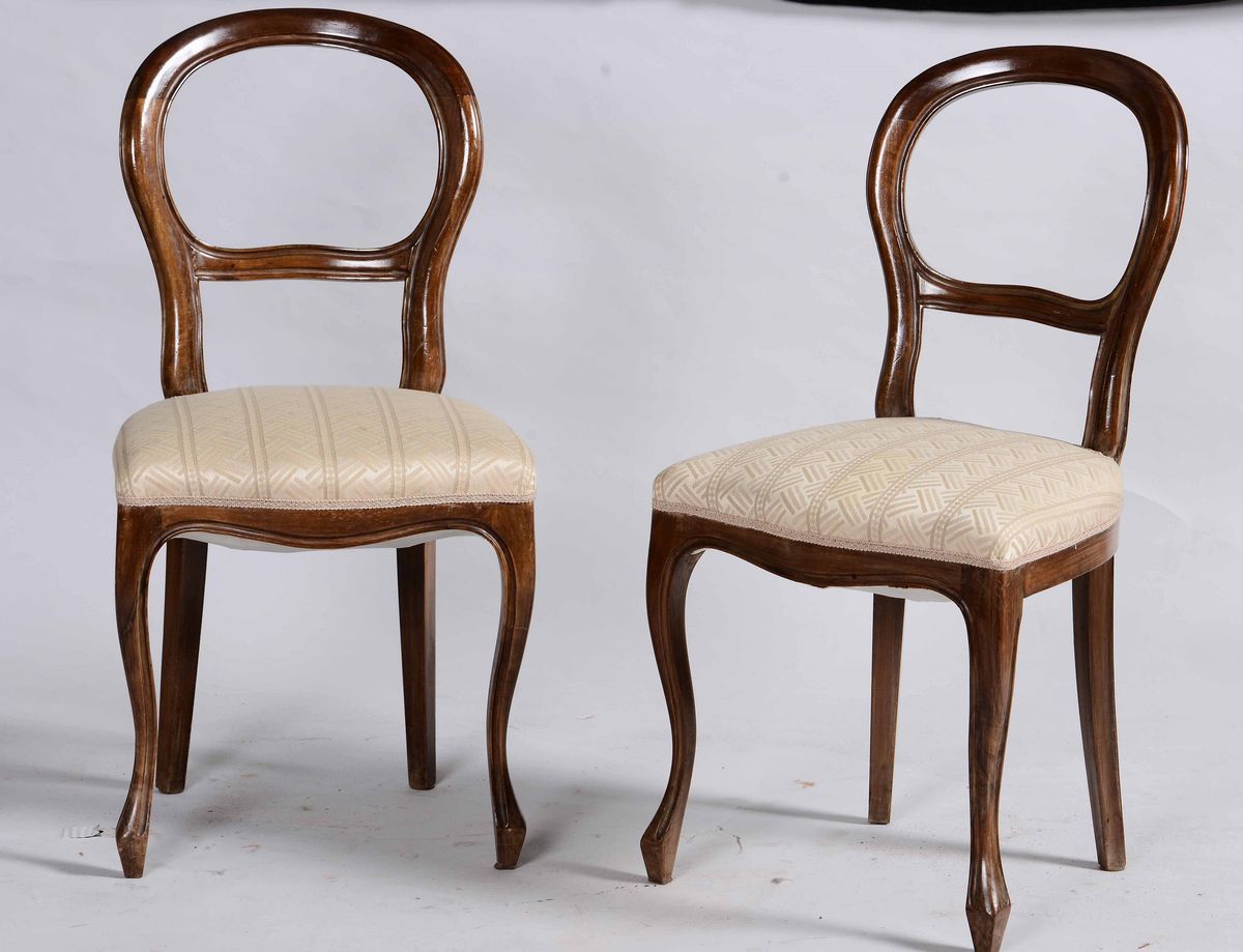 Sei sedie in mogano con schienale ad arco e sedute imbottite, XIX secolo