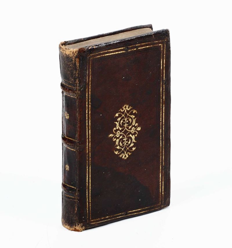 In-12°. Bella legatura in marocchino rosso del secolo XVII. Mancanza di 2 tasselli al dorso integrati successivamente. Piacevole edizione. Ex libris manoscritto al verso del frontespizio.