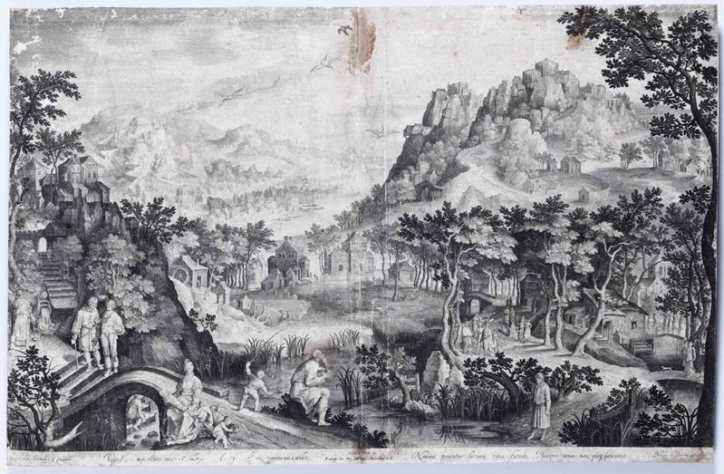 Nicholas de Bruyn (datate 1607) Due stampe, di cui una raffigurante Paesaggio montano con fiume ed il Profeta Osea. Cm 43,5 x 67 e cm 42 x 67. Entro cornice moderna conservata tra due vetri. Una delle due incisioni presenta abrasioni, macchie e altri piccoli difetti.