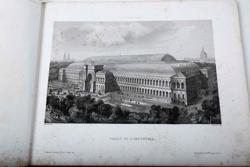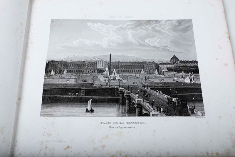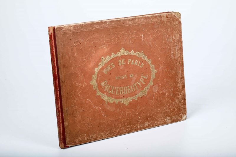 In-4° oblungo. Legatura coeva in mezza pelle e tela per callina. Titoli in oro al piatto anteriore e al dorso. Bella raccolta di vedute di Parigi derivate da dagherrotipo.