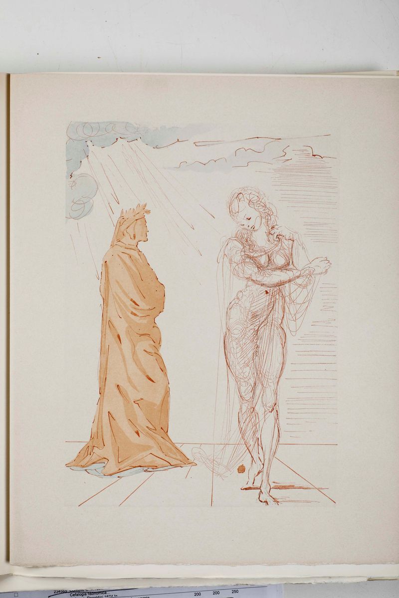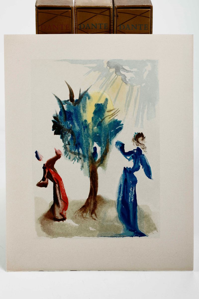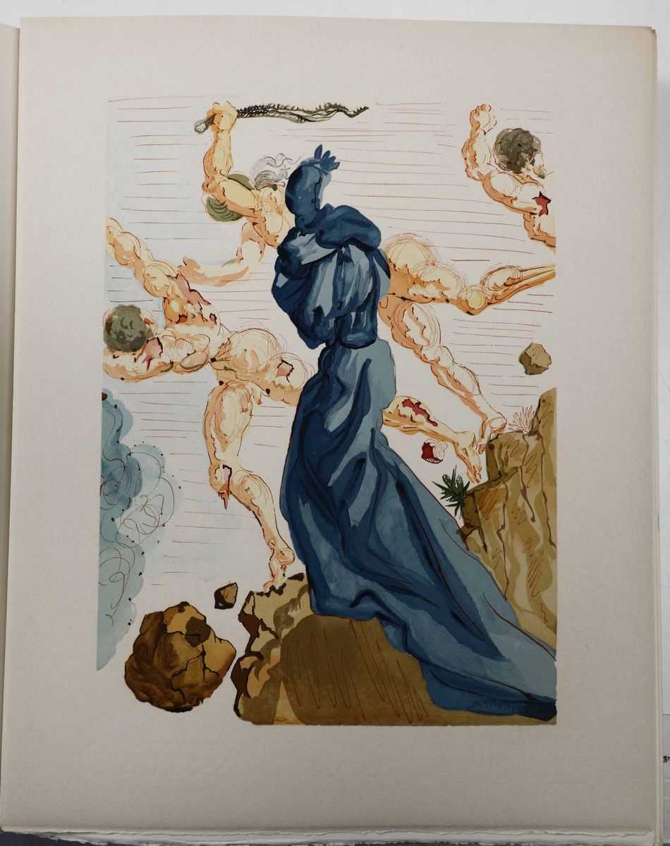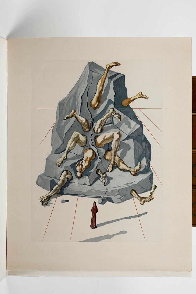 In-folio. Sei volumi a fogli sciolti, contenuti entro camicie editoriali e copertina cartonata, il tutto entro cofanetto editoriale. Illustrata da 100 tavole a colori prodotte dal genio bizzarro di Salvador Dalì. In occasione del 700° anniversario della nascita di Dante, venne commissionata a Dalì, l'illustrazione della Divina Commedia. Il maestro impiegò nove anni di lavoro per dar vita ai 100 acquerelli da cui furono tratte le magnifiche xilografie a colori. Tiratura normale di 2900 esemplari numerati.
