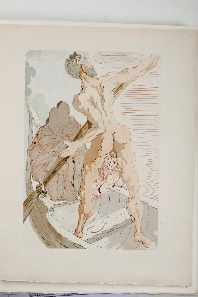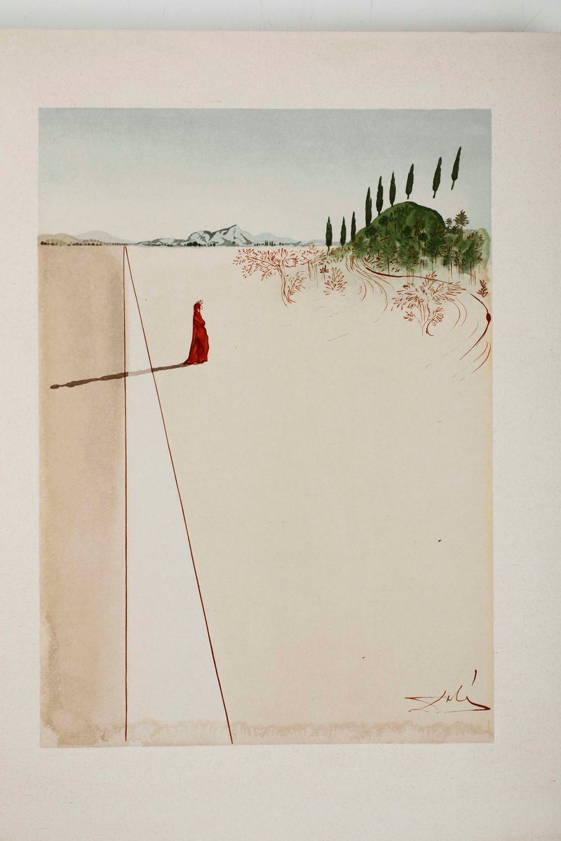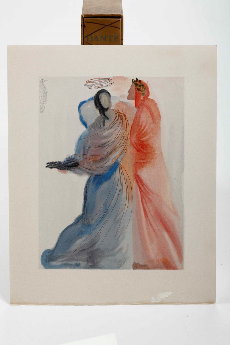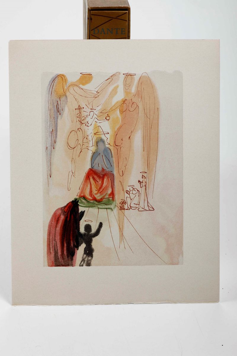 In-folio. Sei volumi a fogli sciolti, contenuti entro camicie editoriali e copertina cartonata, il tutto entro cofanetto editoriale. Illustrata da 100 tavole a colori prodotte dal genio bizzarro di Salvador Dalì. In occasione del 700° anniversario della nascita di Dante, venne commissionata a Dalì, l'illustrazione della Divina Commedia. Il maestro impiegò nove anni di lavoro per dar vita ai 100 acquerelli da cui furono tratte le magnifiche xilografie a colori. Tiratura normale di 2900 esemplari numerati.