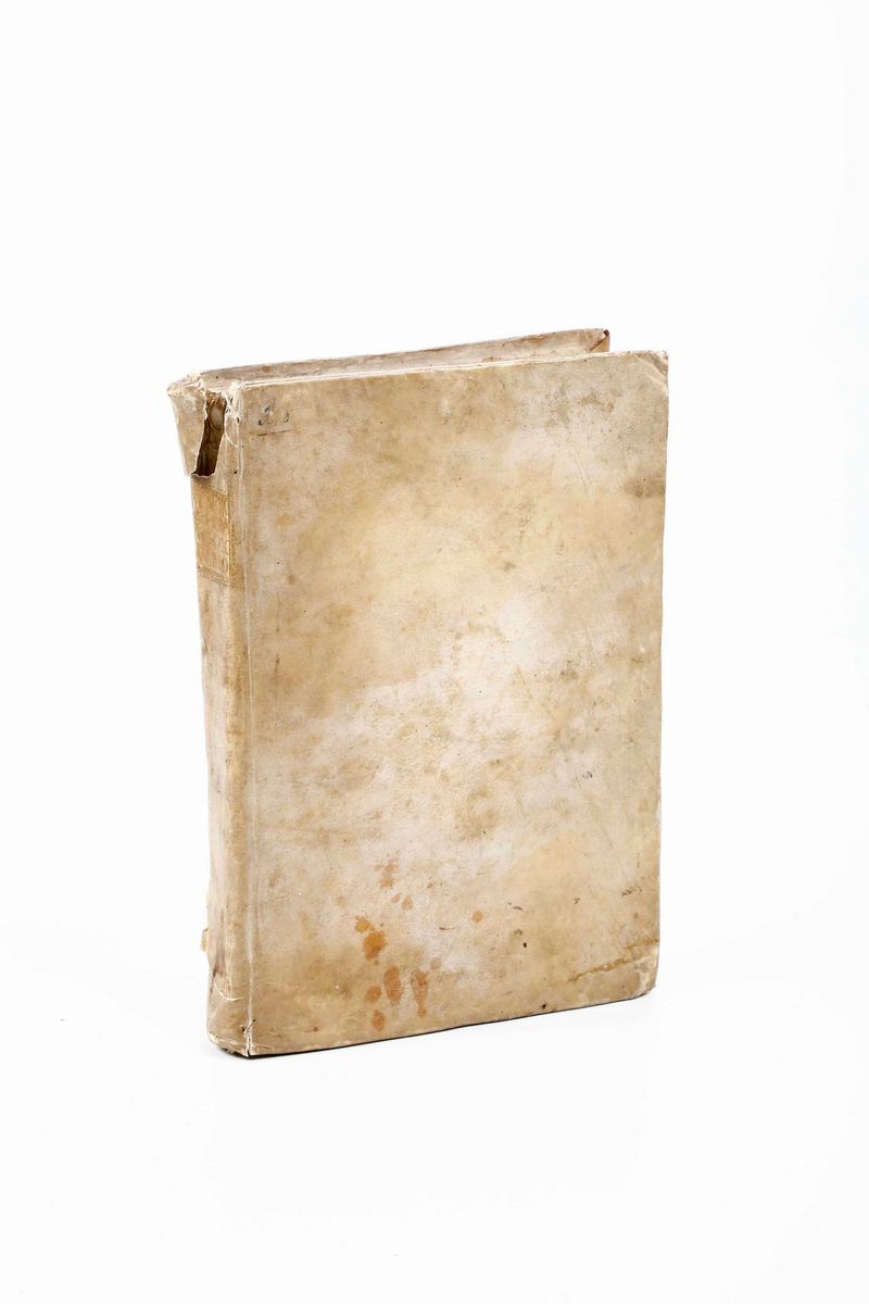 Legatura antica in pergamena. Difetti, bruniture e piccole gallerie di tarlo marginali. Belle figure incise in xilografia.
