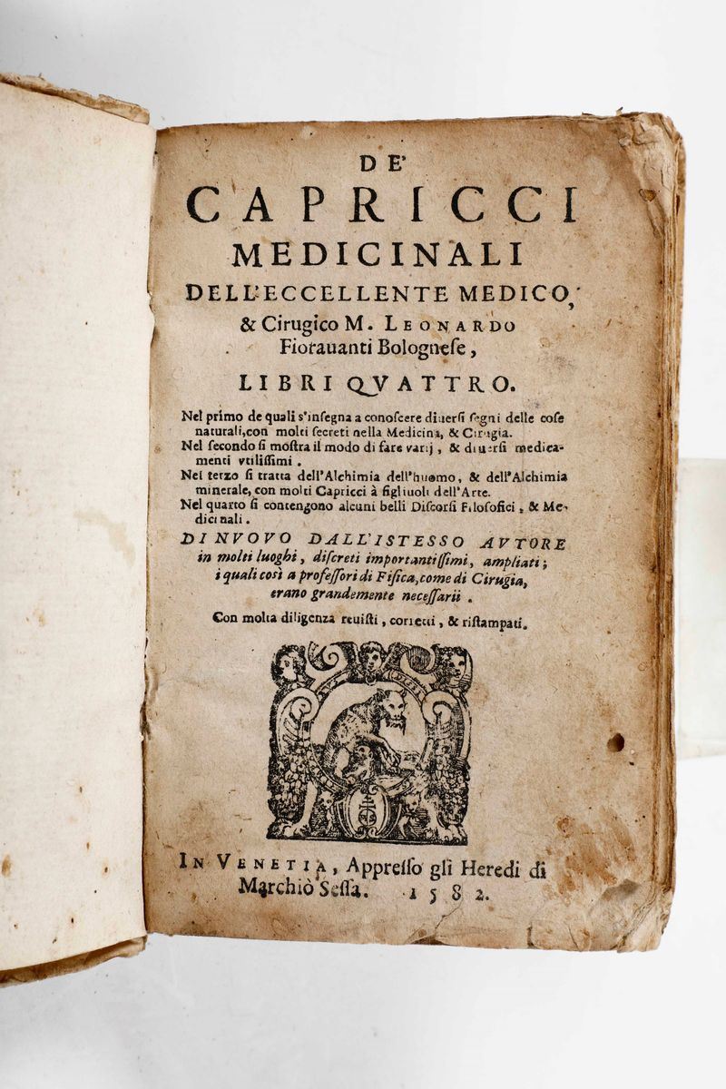 In-8°.(Pergamena floscia rinforzata al dorso). SI AGGIUNGONO NEL LOTTO: Fioravanti, Leonardo-De' Capricci medicinali...Venezia,Heredi Sessa, 1582. / Gioseffo, Flavio-Guerre giudaiche...Venezia, Griffio,1589. / Quirico degli Augusti-Lume de speciali...Seconda metà sec.XVI. (Acefalo, mancante del primo quaderno e di alcune carte interne).