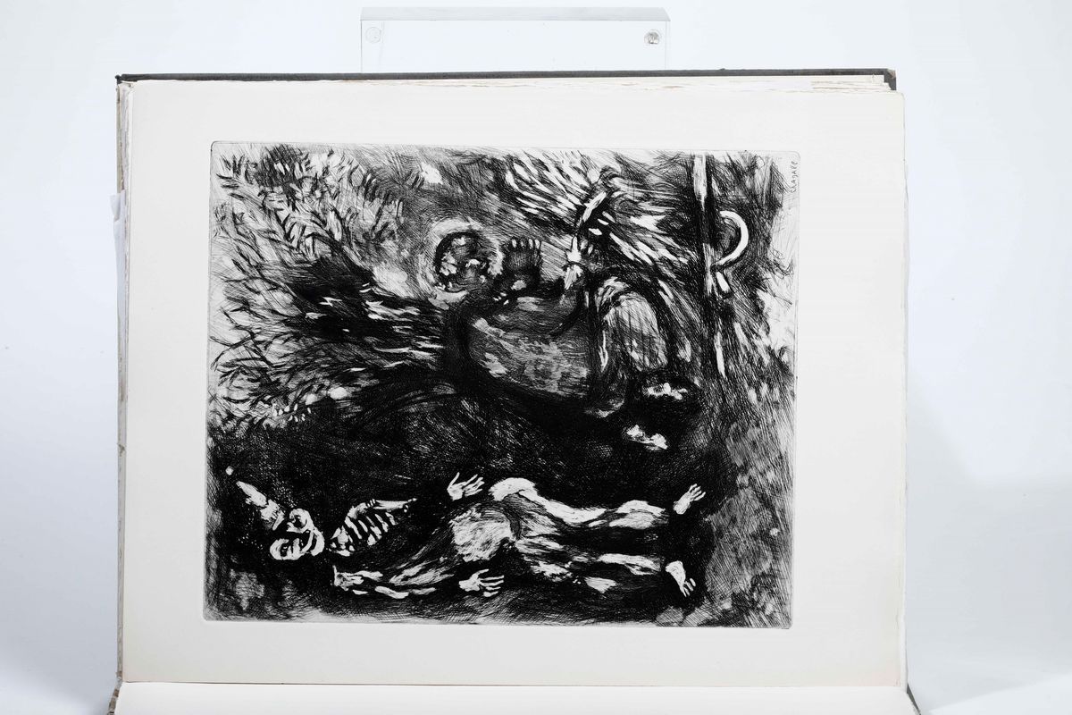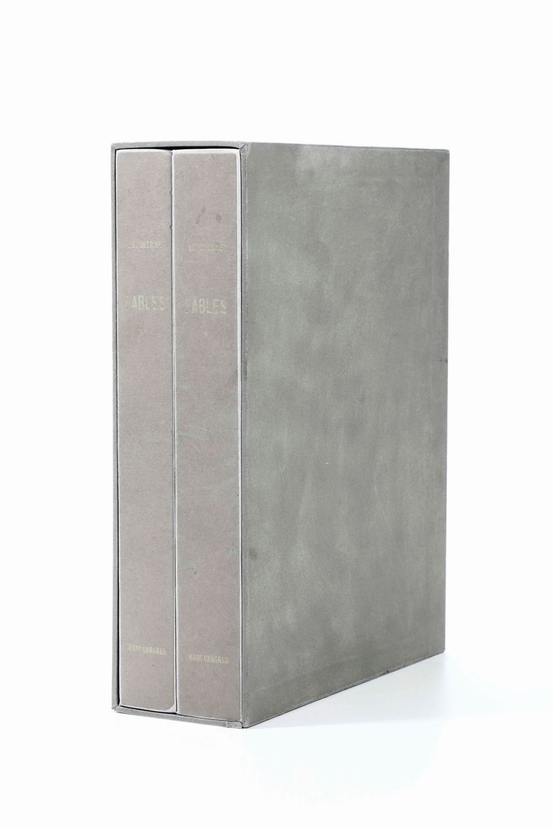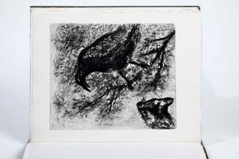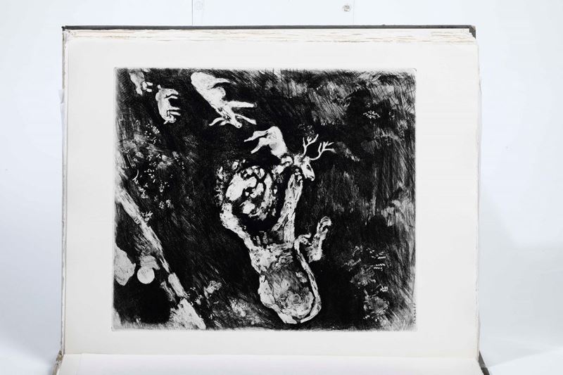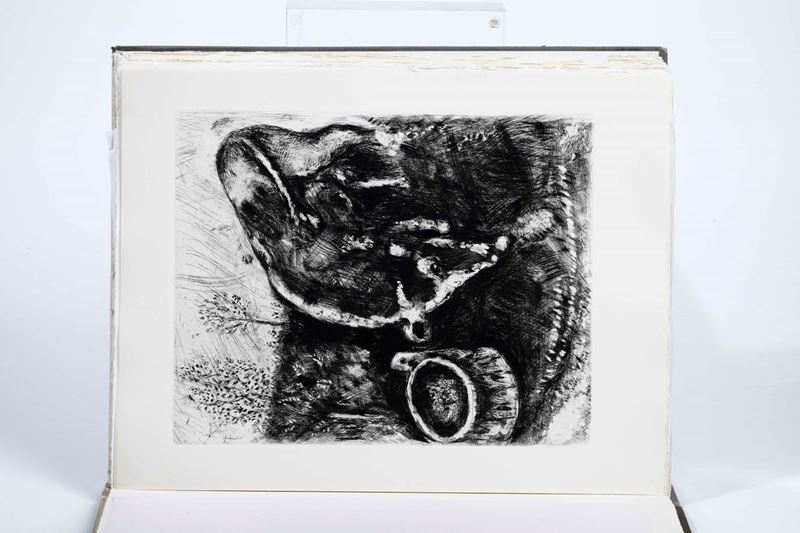 In-folio. Cm 39 x 30,5. Due volumi. A fogli sciolti entro copertine originali illustrate con due incisioni del celebre artista russo, naturalizzato francese. Entro custodia. Opera illustrata da 100 + 2(copertine) acqueforti originali di Chagall stampate su tavole fuori testo.