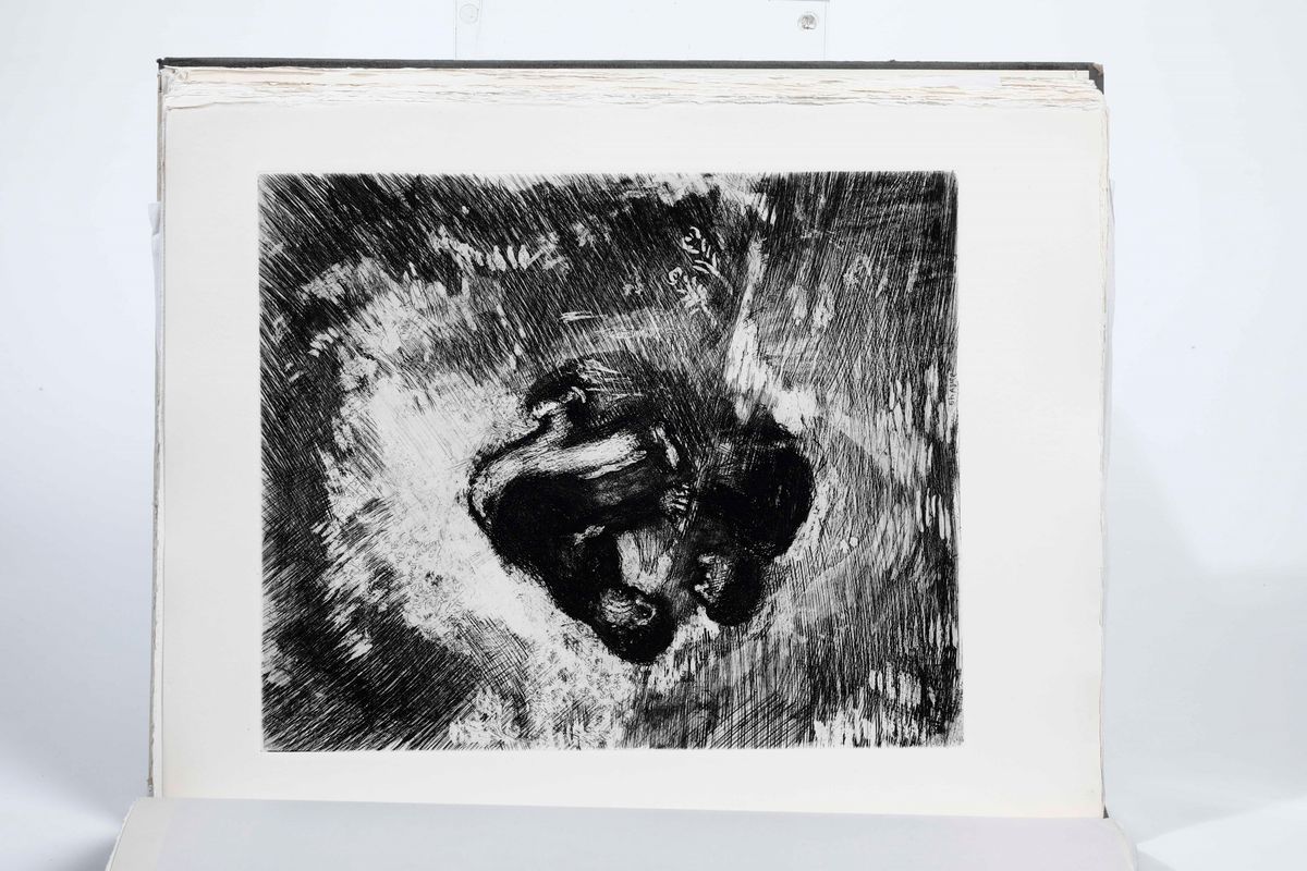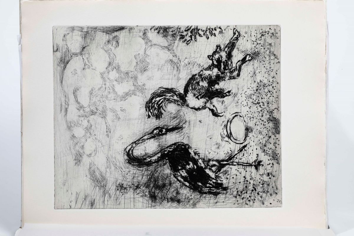Alla morte di Vollard, avvenuta nel 1939, sia le Fables che Les ames mortes oltre alla grande Biblia, rimangono inedite. Solo l'intelligente intraprendenza visionaria di Teriade, saprà realizzare tra il 1948 e il 1956, questi tre capolavori. Il nostro esemplare, in ottimo stato, appartiene alla tiratura su velin de Rives, di soli 200 esemplari, recanti la firma autografa di Marc Chagall.