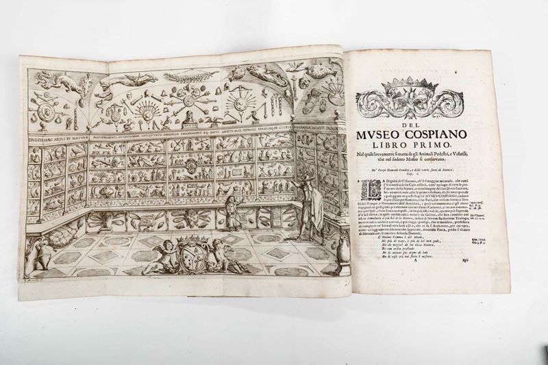 In-folio. 532 pagine, 24 romane (compreso il ritratto dell'autore più 532 pagine). Legatura coeva in pena pergamena rigida. Grande tavola incisa ripiegata raffigurante il Museo Cospiano, e decine di illustrazioni xilografiche nel testo. Alcune carte brunite ma buon esemplare.