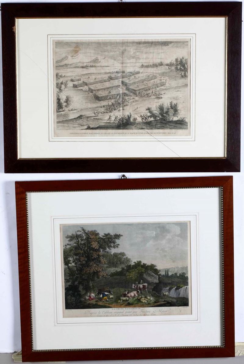 Belle incisioni in coloritura della fine del secolo XVIII, inizi secolo XIX a soggetto mitologico di gusto Neoclassico, entro eleganti cornici con finiture metalliche. Cornice cm 66x73. Si aggiungono nel lotto altre due incisioni: la prima inglese del secolo XVIII in coloritura. La seconda una scena di battaglia del XVIII secolo. (relativamente all'ultima vetro rotto)