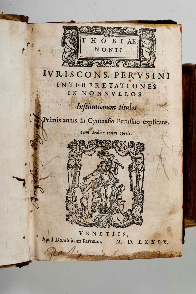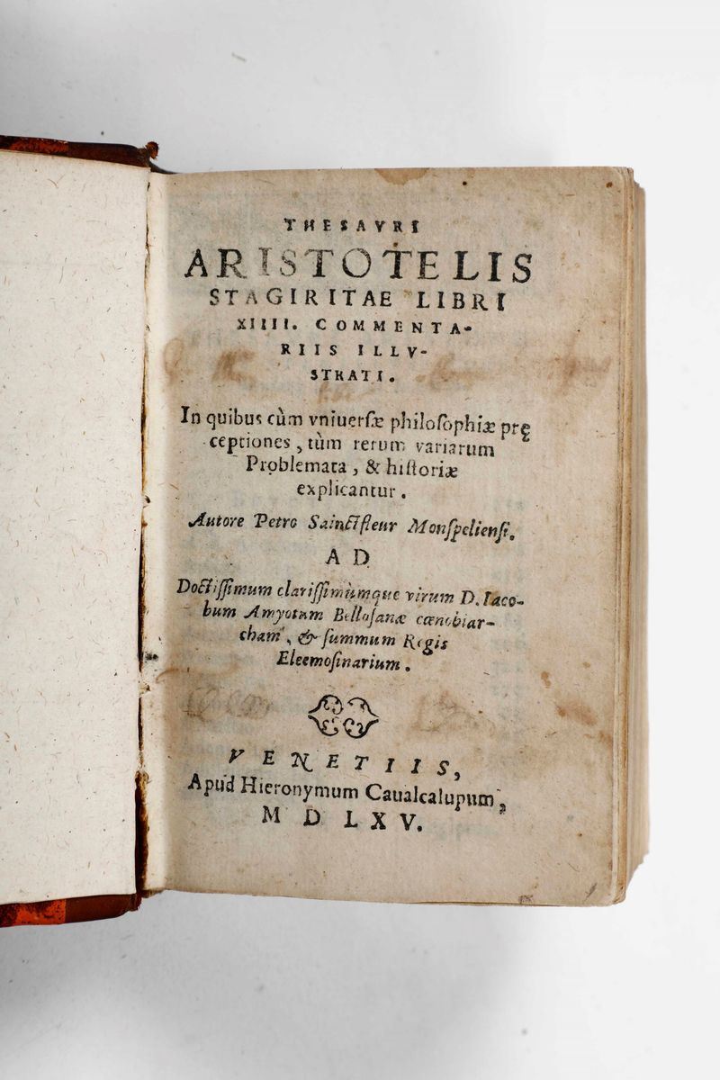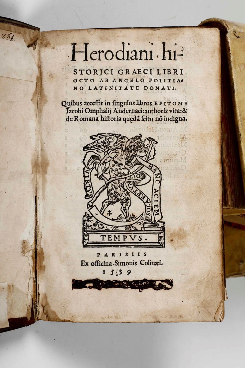 In-8°. Pergamena del secolo XVIII. Fioriture e piccoli restauri. SI UNISCONO NEL LOTTO: Poliziano-Herodiani historici graeci libri octo ab angelo Politiano latinate donati. Parisiis, Ex off. Simonis Colinae,1539. (Bella legatura in piena pelle coeva)./ Nonio Tobia-Thobiae nonii iuriscons, perusini interpretationes in nonnullos...Venetiis, Apud Dominicum Farreum, 1579. / Bernardo-Divi Bernardi abbatis: doctoris sanctissimi...Sermoni..Venezia, Cesare Arrivabene,1518. / Thesauri Aristotelis stagiritae libri XIIII...Venetiis, Cavalcalupum,1565.