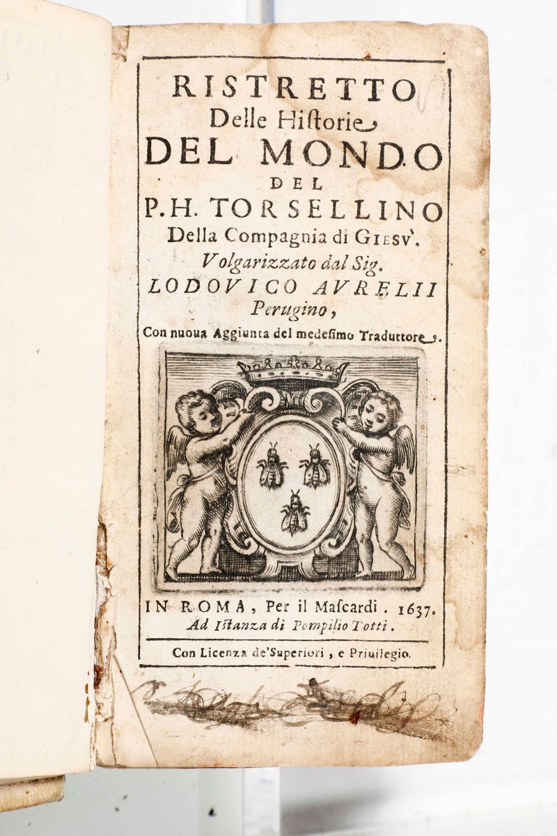In-4°. Legatura in mezza pergamena. Bruniture dovute alla qualità della carta. Due parti rilegate insieme. Si aggiungono nel lotto: Cornelii Schreveli, Lexicon Manuale Graeco-Latino, Augusta 1796. Giocanni Boccaccio, Della genealogia degli Dei, Venezia, 1585. Manoscritto di logica, (copia scolastica), secolo XVIII. Decisiones rotae 1548. Giovanni Boccaccio, Il Decamerone, Bologna, l'Elio Dalla Volpe, 1751. Riflessioni di De La Rochefoucaut, Firenze, 1763. Ristretto delle storie del mondo, P. H. Torsellino, Roma, Mascardi, 1637 (scompleto).