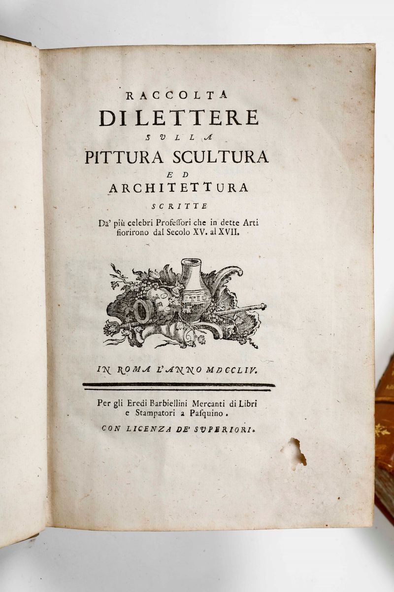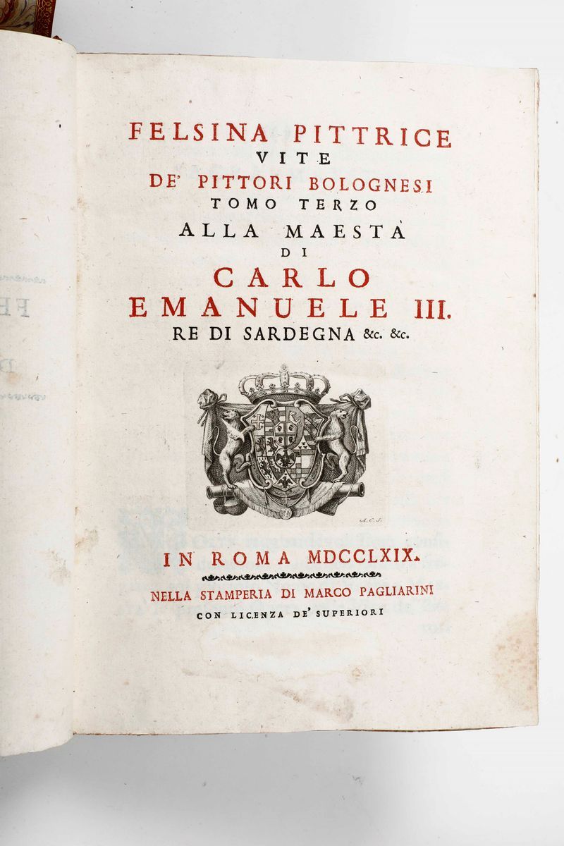 In-4°. Legatura in mezza pelle coeva (abrasioni al dorso). Ex libris moderno al contropiatto. Al lotto si aggiungono: Delle raccolte di lettere sulla pittura, scultura ed architettura, in Roma, per gli Eredi Barbiellini, 1754. Felisina pittrice vite de pittori bolognesi, tomo terzo, in Roma, nella stamperia di Marco Pagliarini, 1769, dorso parzialmente staccato.
