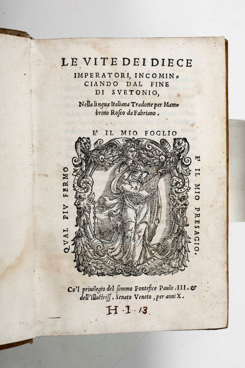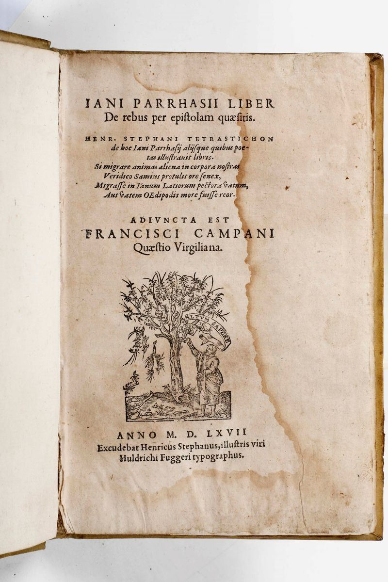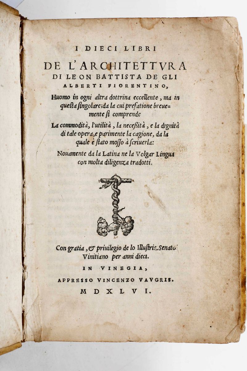 In-8°. Legatura in mezza pergamena e punte del secolo XIX. SI AGGIUNGONO NEL LOTTO: Gli otto libri di Thucydite...tradotto per Francesco di Soldo Strozzi...In Venezia, Baldssar de Costantini,(1545). / Alberti Leon Battista-I dieci libri de l'architettura...Venezia, Valgrisi,1546. (Scompleto di alcune carte). / Iani Parrhasii liber...(Parigi, Heri Estienne, 1567). / Svetonio-Le vite dei diece imperatori, incominciando dal fine di Svetonio...Venezia,Tramezzino,1544.