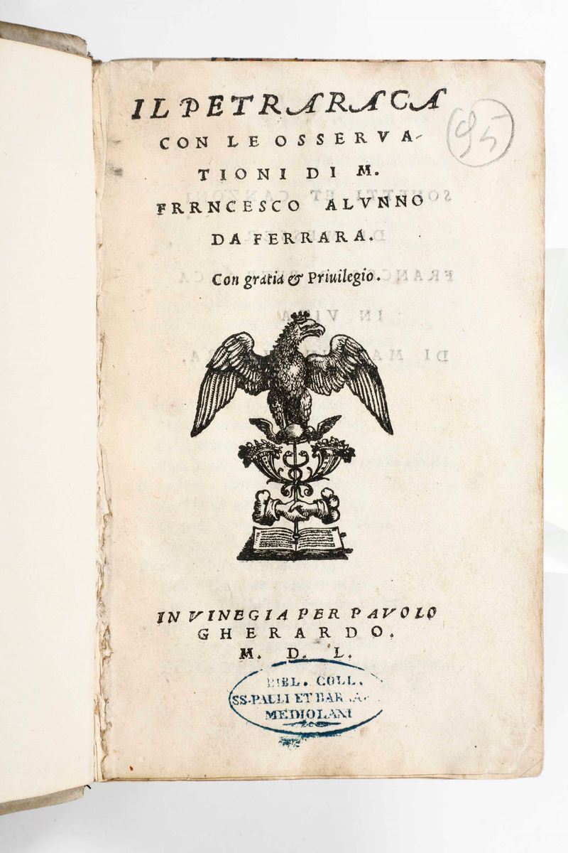 Il Petrarca con le osservationi M. Francesco Alunno da Ferrara...In Vinegia, Per Pavolo Gherardo(Comin da Trino, in fine), 1550