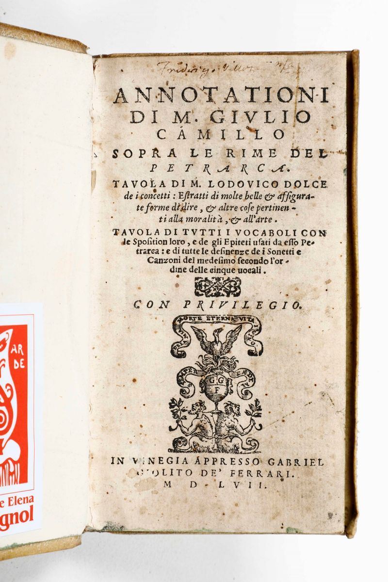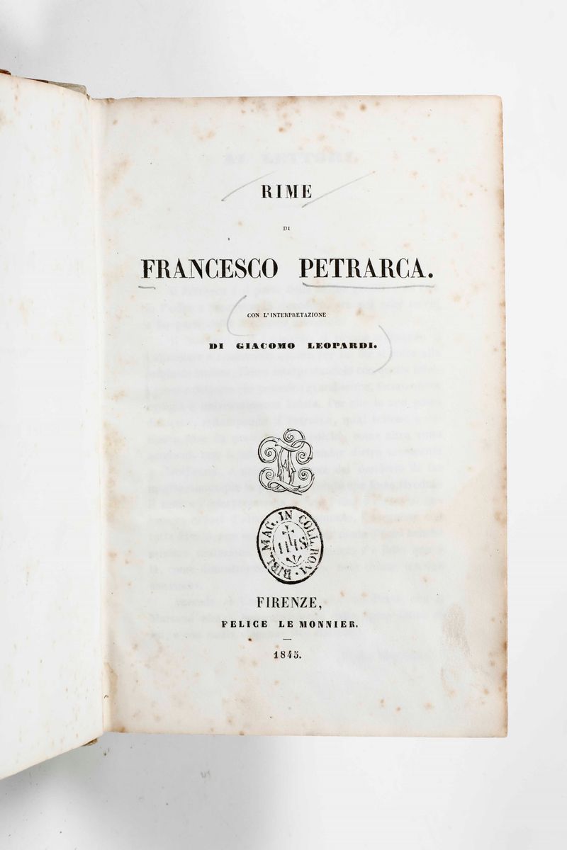 In-8°. Legatura in mezza pergamena del secolo XIX. Ex libris a timbro al frontespizio. Si uniscono nel lotto:Giulio Camillo. Annotazioni sopra le rime del Petrarca. Venezia, Giolito, 1557. Rime di Francesco Petrarca con l'interpretazione di Giacomo Leopardi. Firenze, Le Monnier, 1845. Ex libris moderno ai contropiatti.