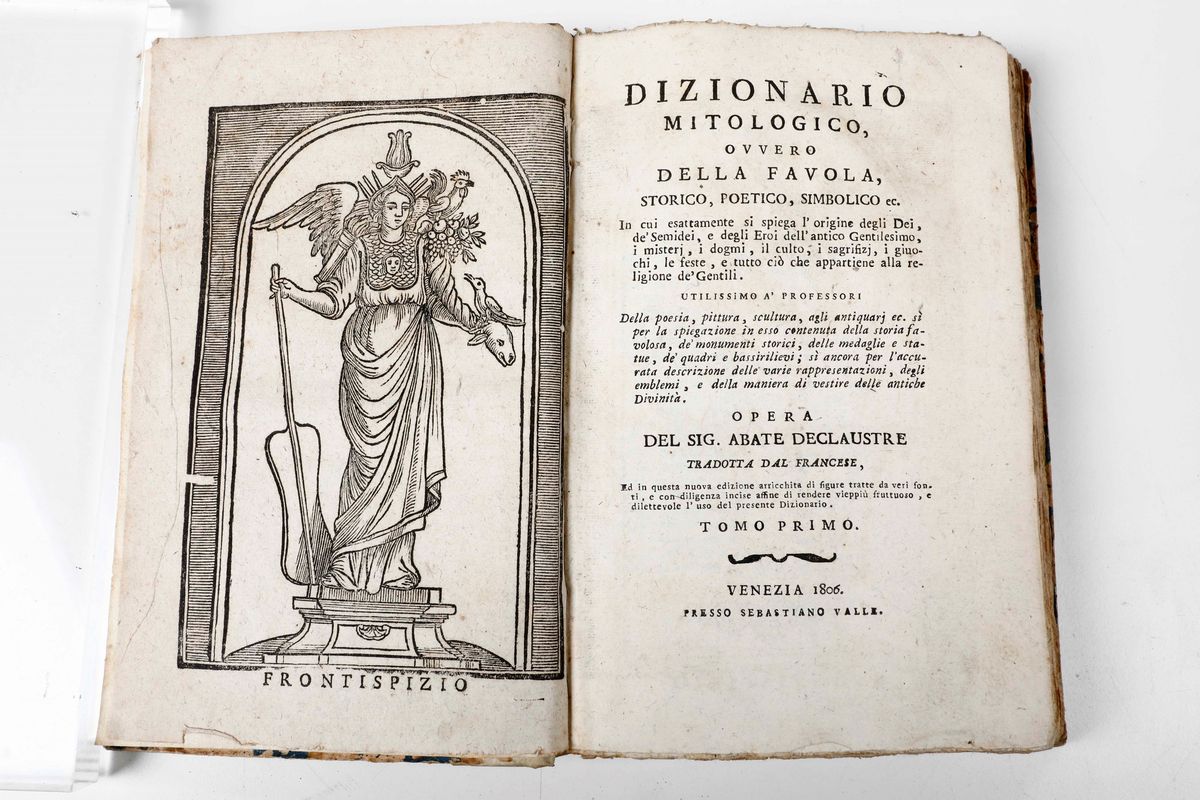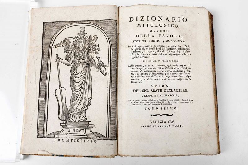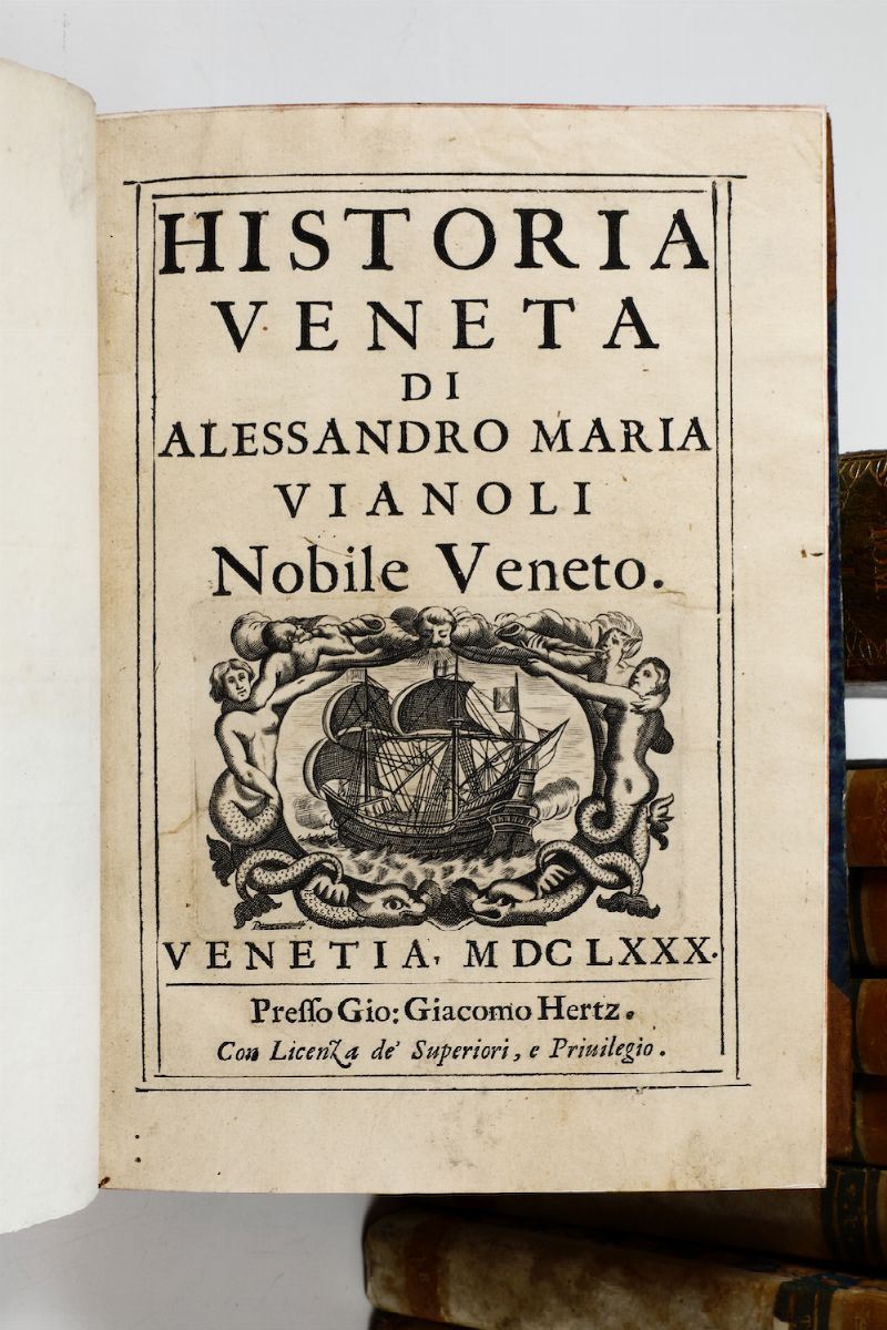 Si aggiungono nel lotto: Declaustre, dizionario mitologico, Venezia, Valle, 1806, legatura coeva in mezza pergamena. Belle illustrazioni xilografiche nel testo. Vianoli Alessandro Maria, Historia Veneta, presso Giacomo Hertz, 1680, 2 volumi, legature coeve in mezza pelle (esemplare scompleto con i frontespizi e altre parti supplite in facsimile).
