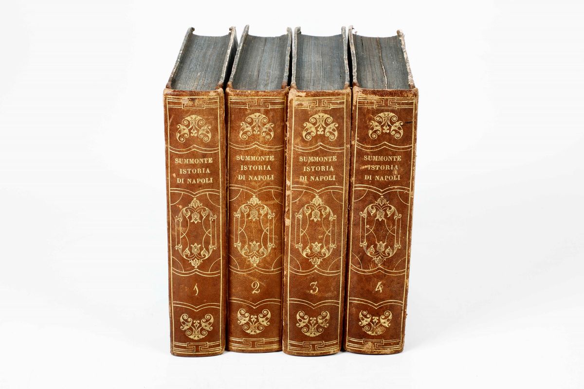 In-4°. 4 volumi. Legatura in mezza pelle del secolo XIX. Seconda edizione di questa importante storia di Napoli. Bruniture e altri piccoli difetti. Adorna di alcune tavole incise in xilografia
