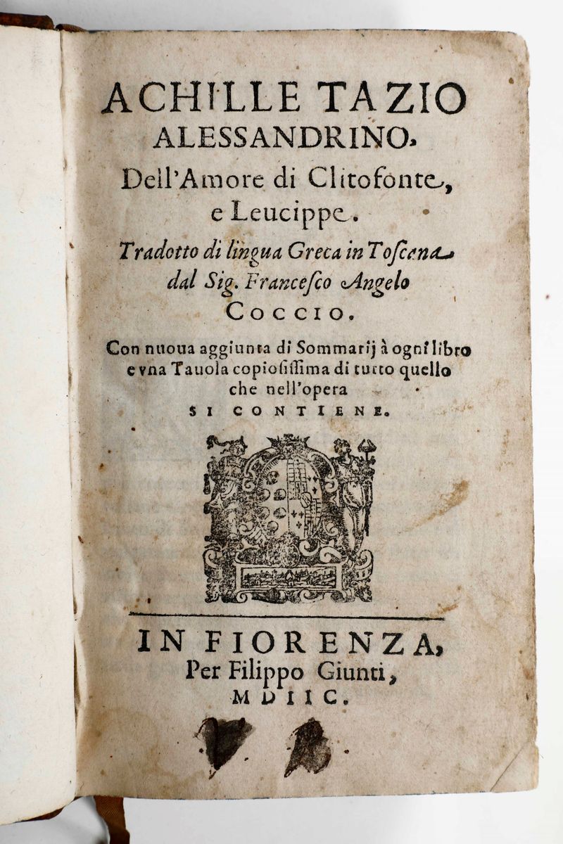 Tazio Achille Alessandrino Dell'Amore di Clitofonte e Leucippe... Firenze, presso Filippo Giunti, 1598.