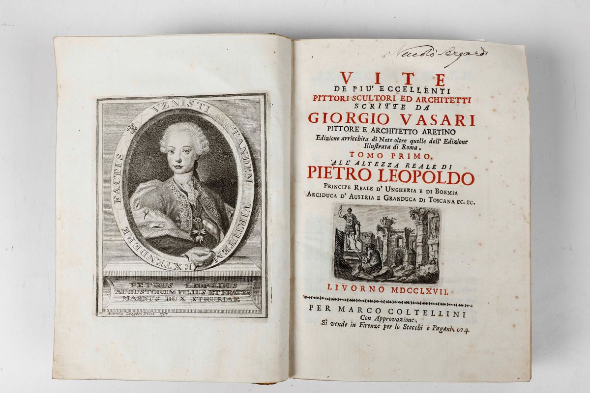 In-4°. Legatura in mezza pelle. Con 150 ritratti e 3 tavole incise in rame. Quinta edizione pubblicata per opera del Cavalier Giudici d'Arezzo.