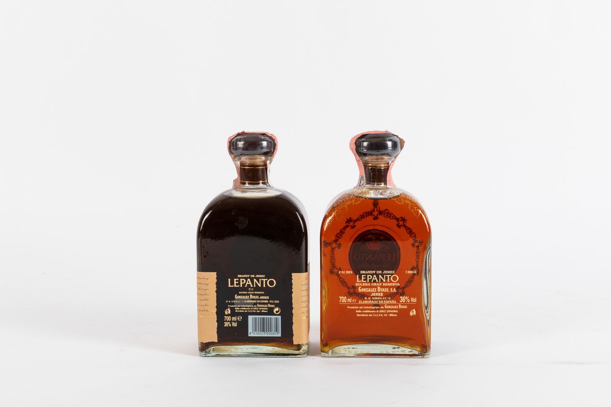 Lepanto, Brandy de Jerez Solera Gran Reserva l'invecchiamento è di un ciclo di 12 anni in solera di rovere americano più una sosta di tre anni in botti che hanno contenuto il pregiato Jerez Noè da uve Pedro Ximenez I lotti contrassegnati con (*) sono stati affidati da soggetti I.V.A. e pertanto le fatture verranno emesse con I.V.A. esposta. L’acquirente pagherà come di consueto il prezzo di aggiudicazione più il corrispettivo d’asta, pari al 25% The lots marked with (*) have been entrusted by V.A.T. subjects and therefore the invoices will be issued with V.A.T. exposed. The buyer will pay as usual the auction price plus the auction fee, equal to 25%