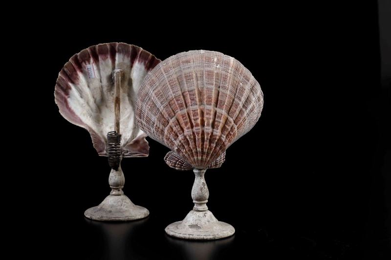 conchiglie Pecten subnodosus, basi tornite e laccate, altezza cm 25,5