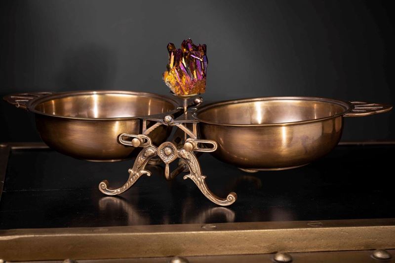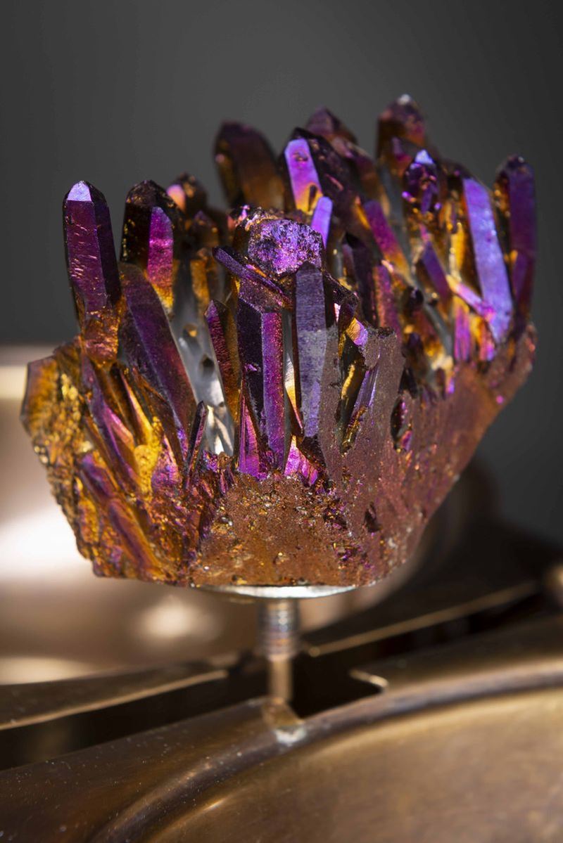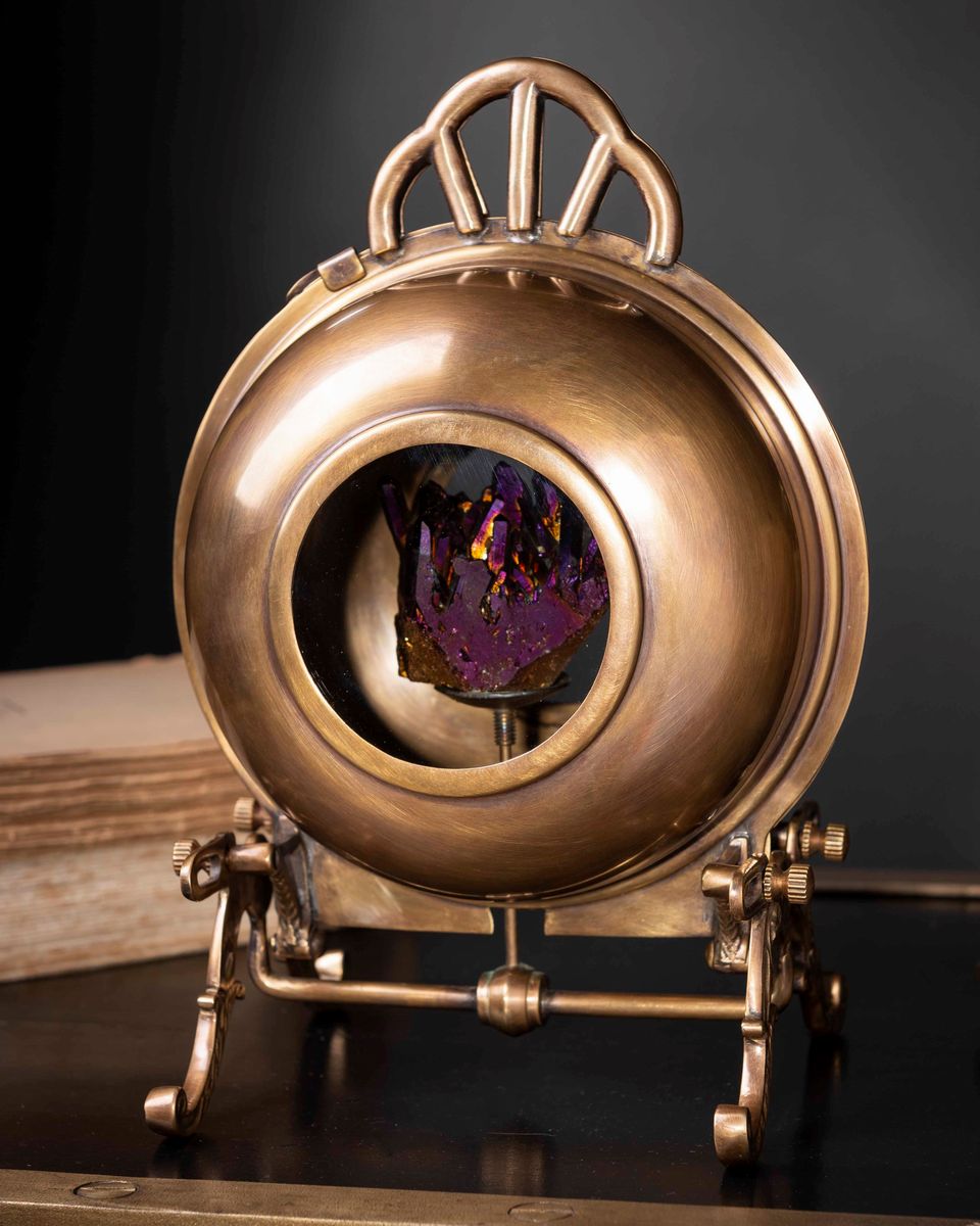 Cristallo di quarzo sinteticamente ricoperto di patina iridescente tramite ionizazzione di vapori di titanio, in base apribile in ottone Cm 26x18x15