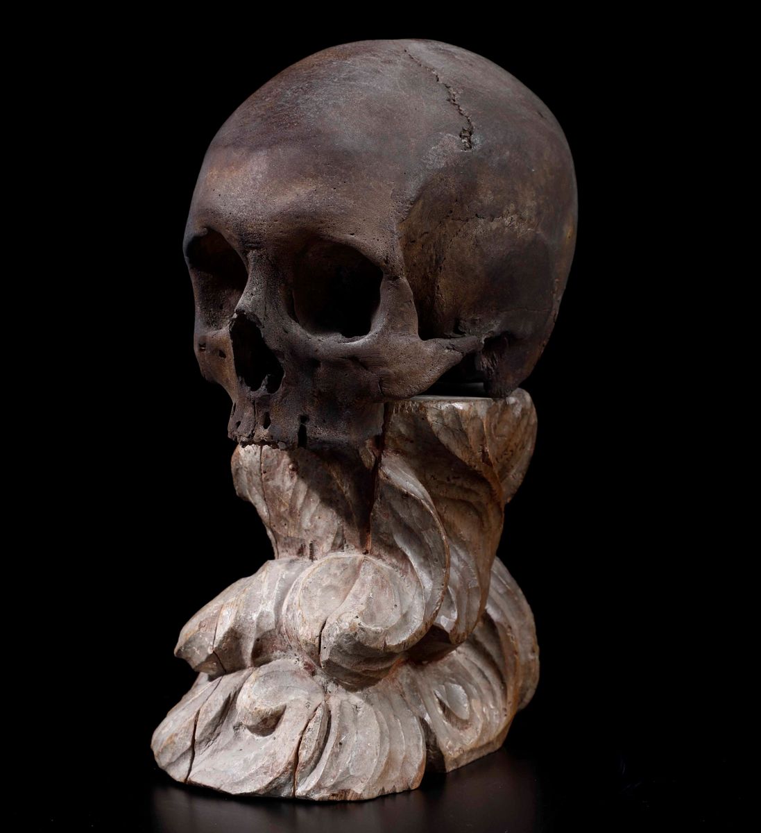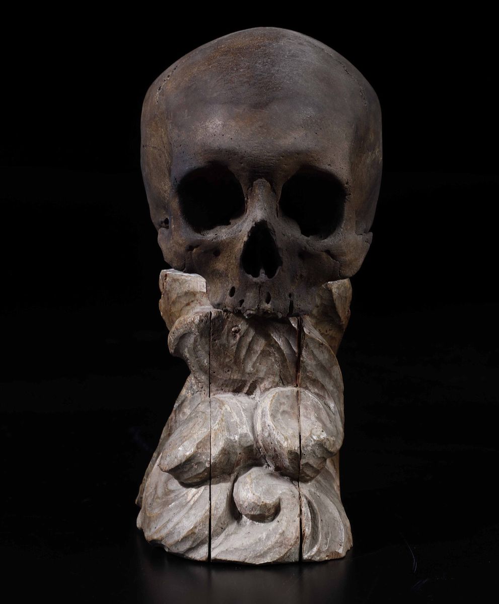 cranio in stucco su nuvole in legno intagliato, altezza cm 30