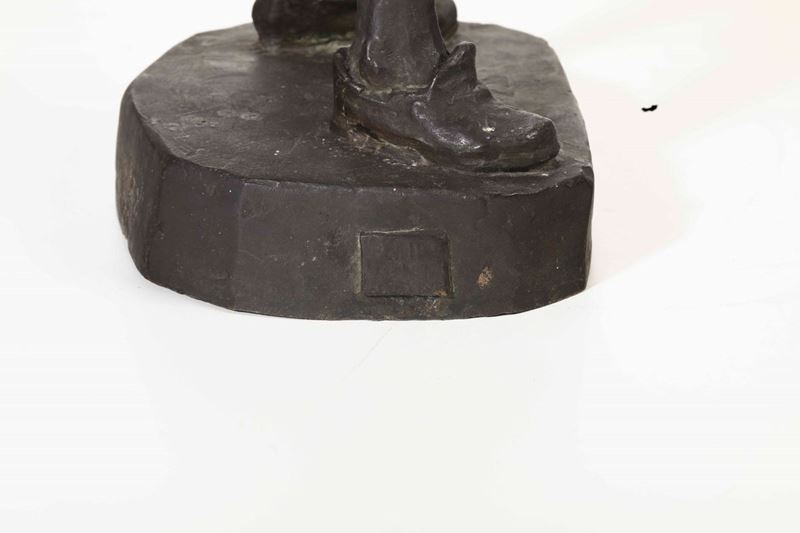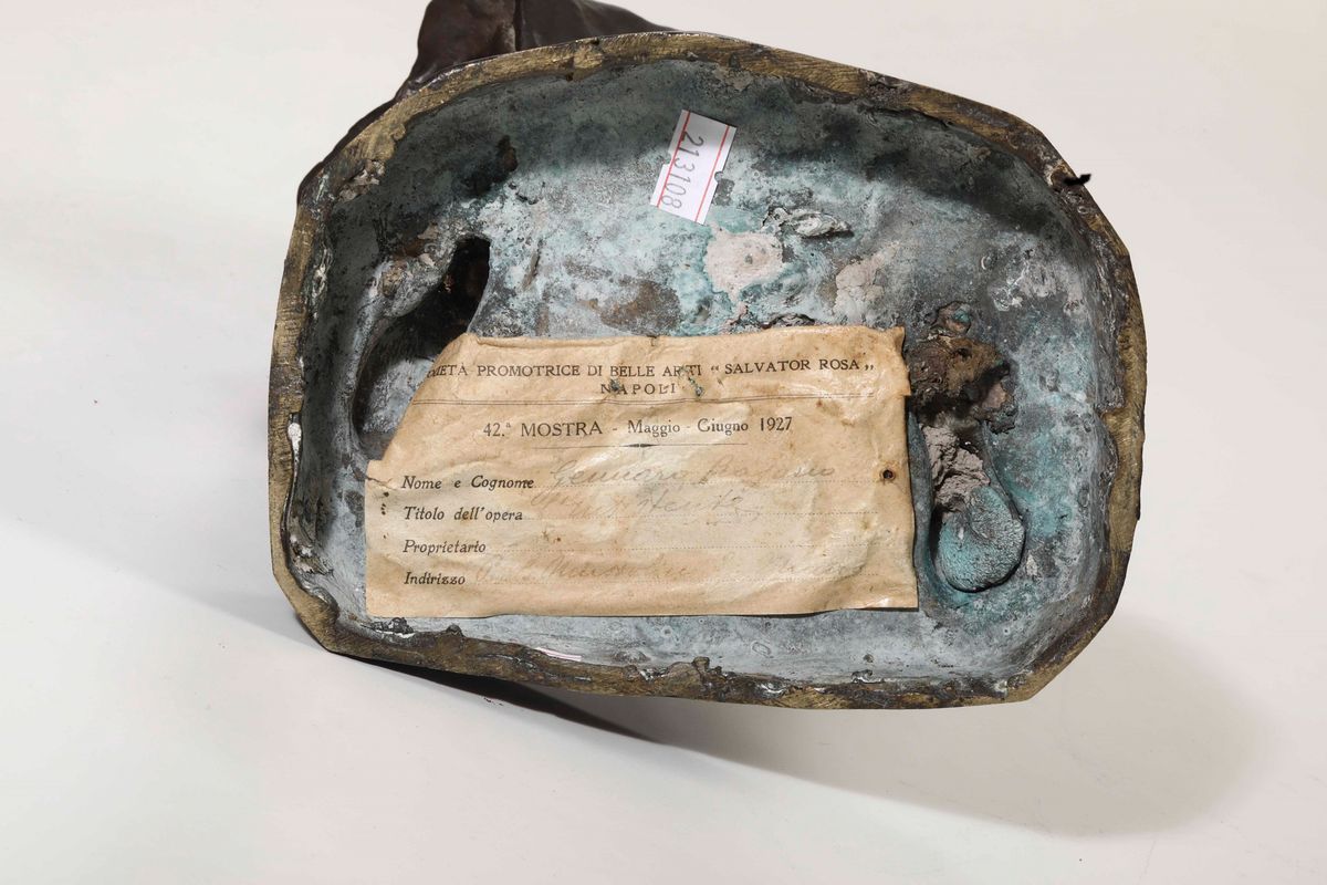 scultura in bronzo, altezza cm 34, firma incisa. Sotto la base etichetta cartacea della 42 Mostra della società promotrice di Belle Arti Salvator Rosa, Napoli, maggio giugno 1927