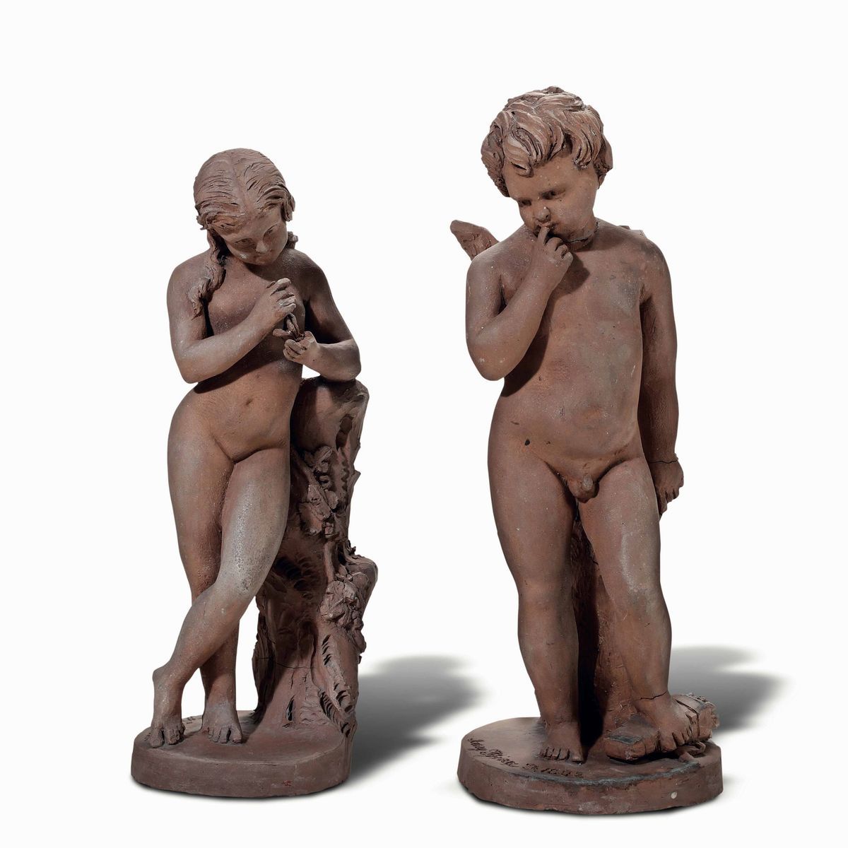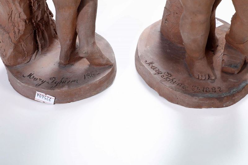 coppia di sculture in terracotta, altezza cm 36, firma incisa alla base Mary Ighina