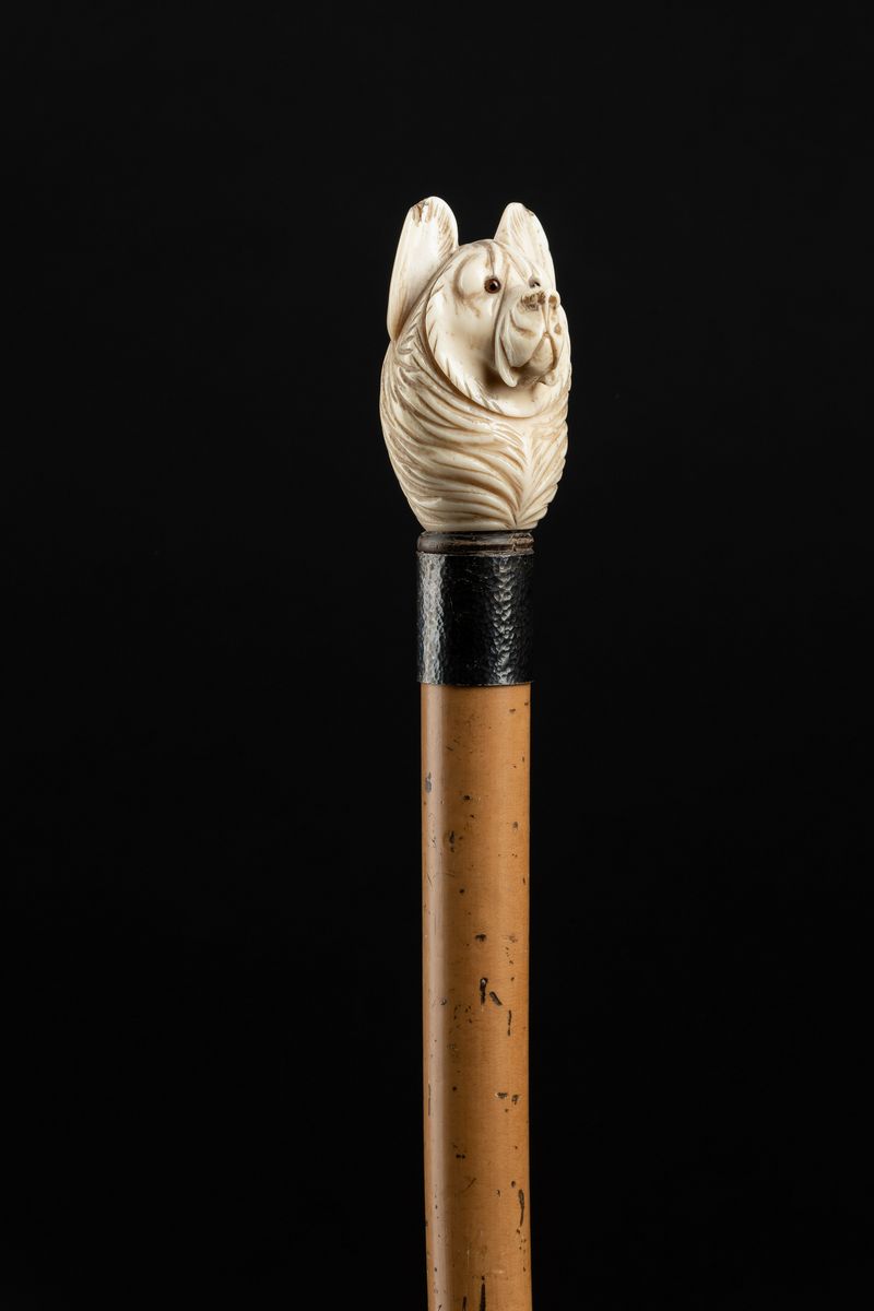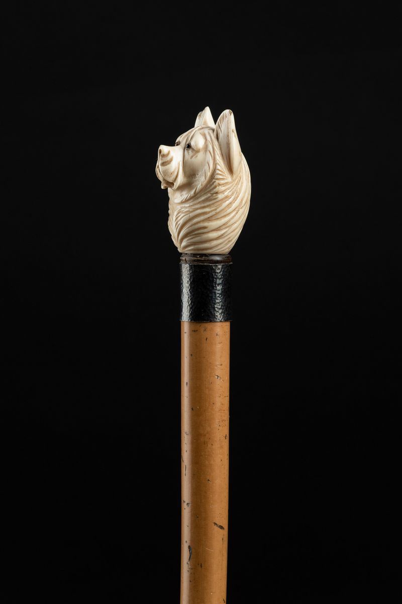 Impugnatura verticale scolpita con testa di cane. Asta in malacca, collarino in metallo martellato.