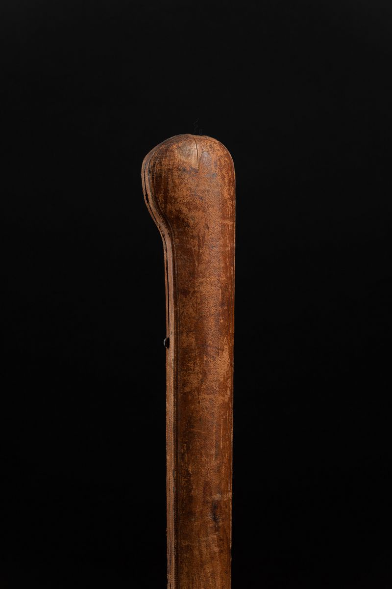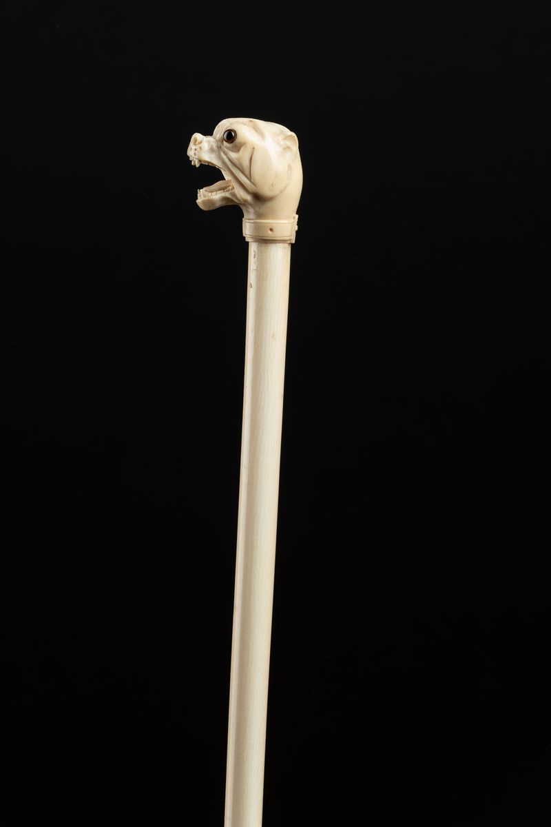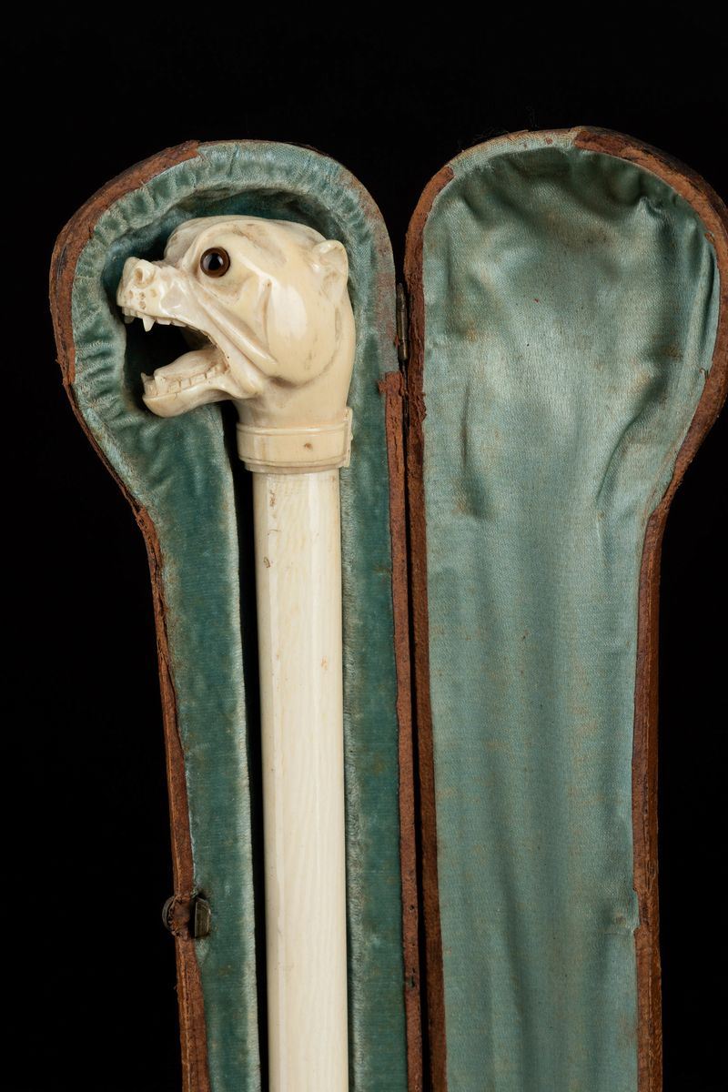 Impugnatura a pomolo scolpita con testa di cane. Asta intera in avorio. Custodia originale.