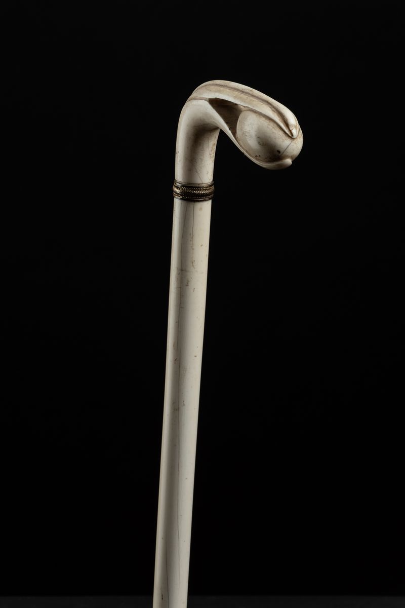 Impugnatura ad L liscia scolpita con becco che tiene un uovo. Asta a segmenti di avorio, collarino in metallo dorato.