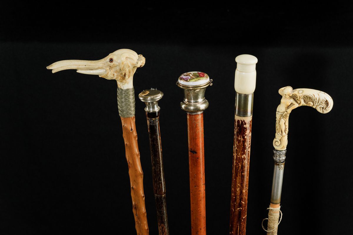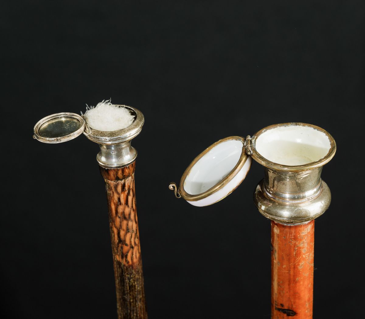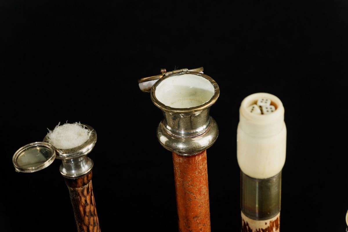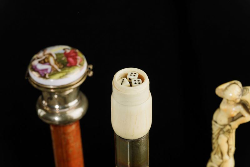 Canne in legno e pomi in avorio e argento, con porta pillole, dadi da gioco e porta cipria