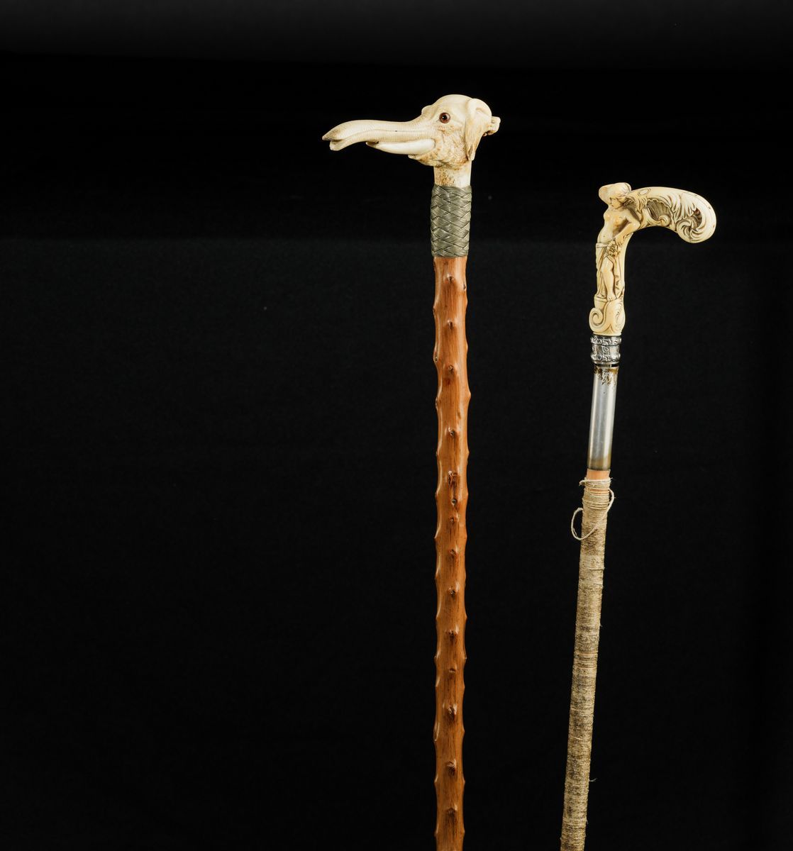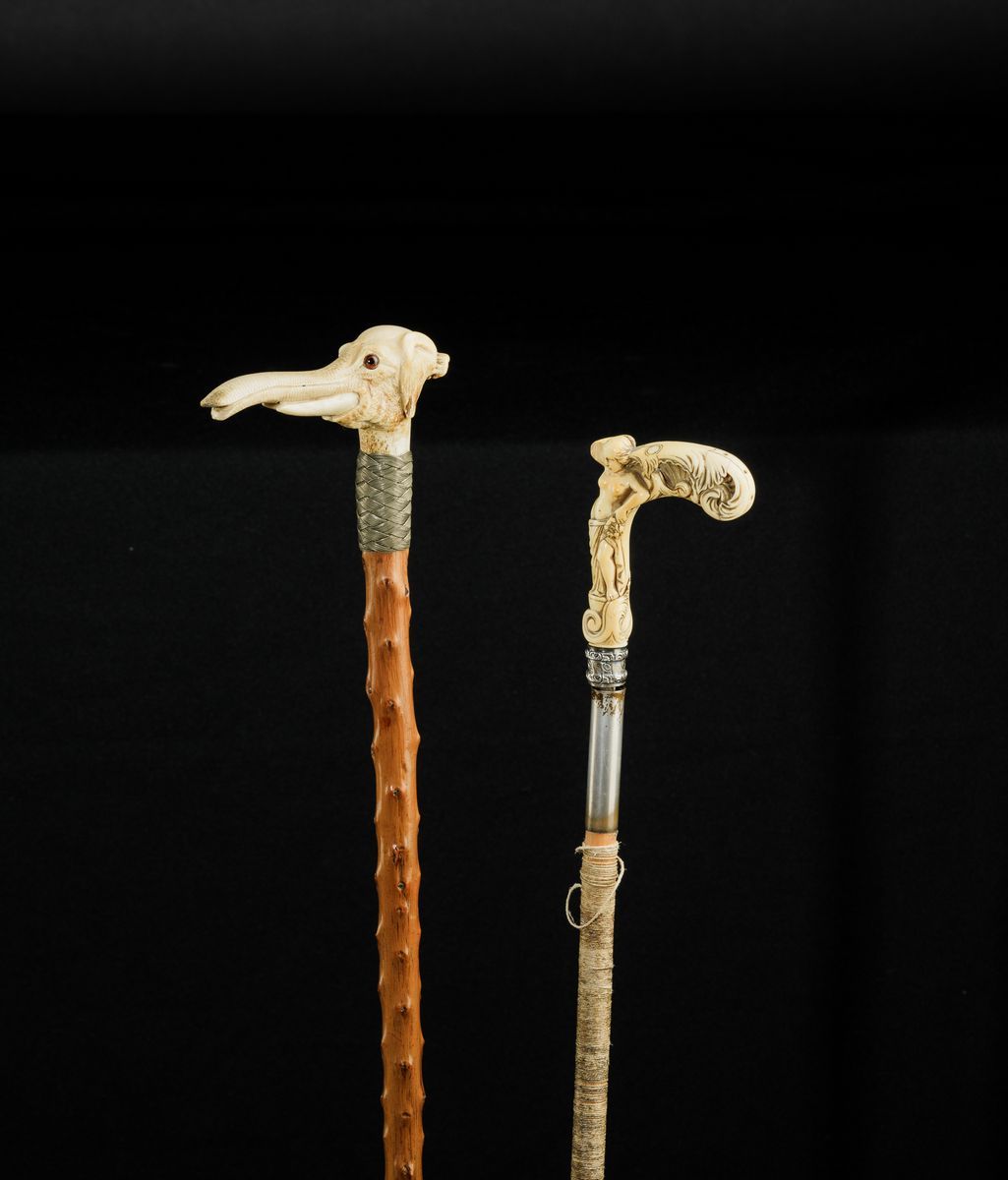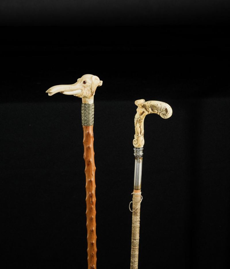 Canne in legno e pomi in avorio e argento, con porta pillole, dadi da gioco e porta cipria