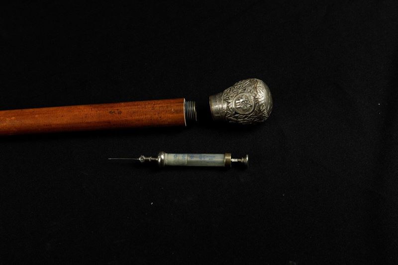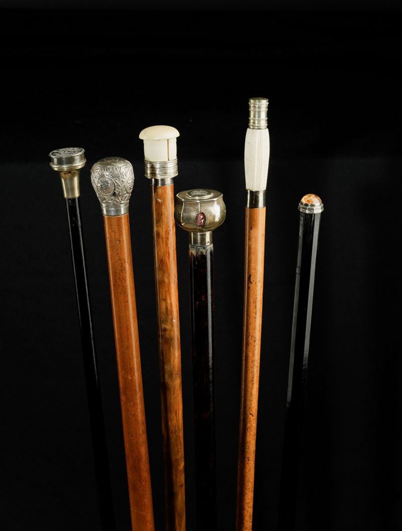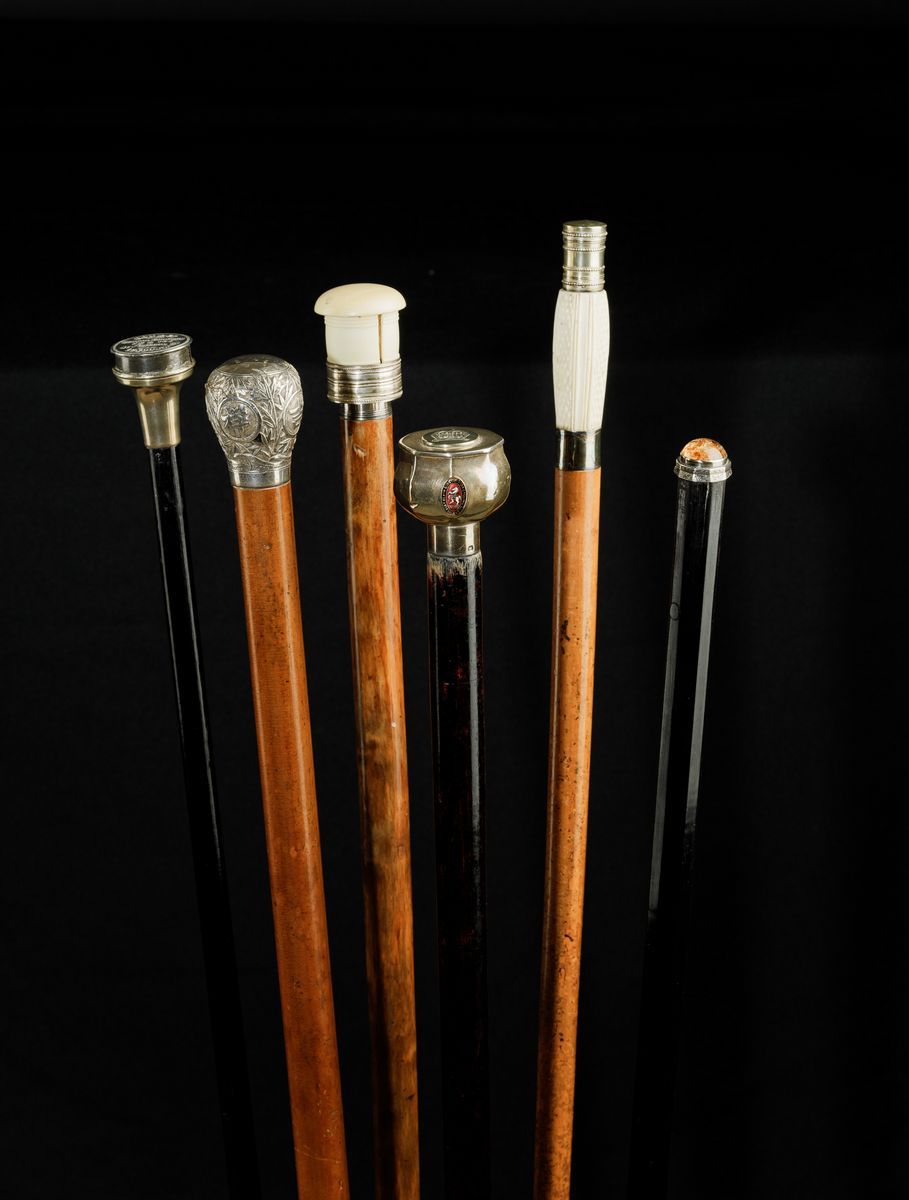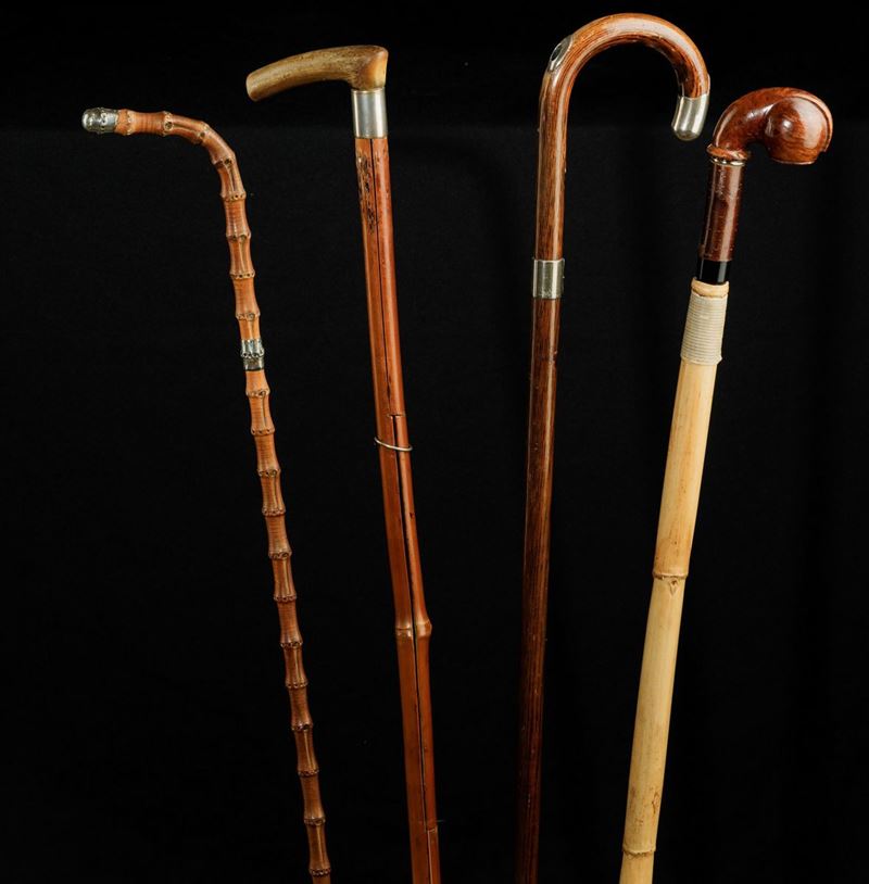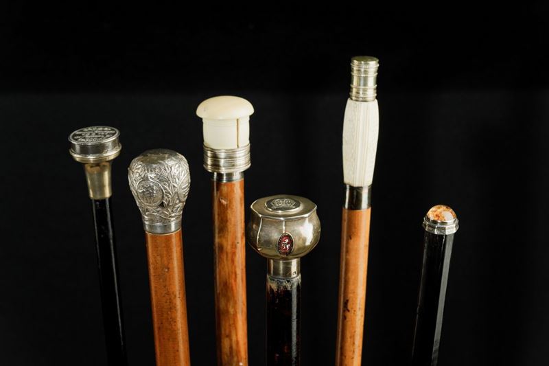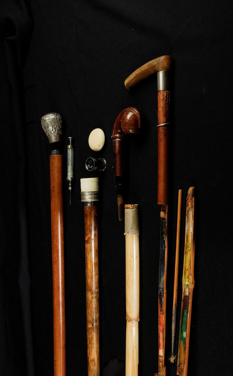 Canne in legno e pomi in avorio e argento, con siringa, strumenti da pittore, cannocchiale e pipa Lunghezza da cm 86 a cm 93