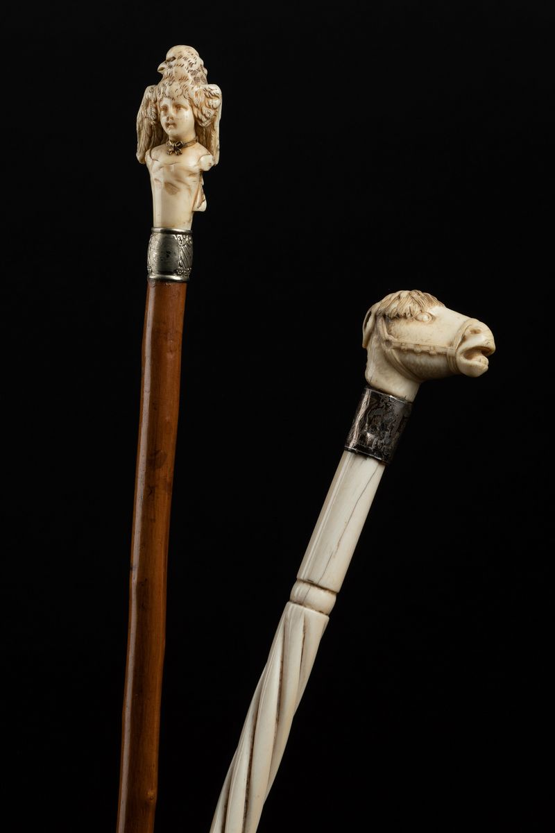 - Impugnatura in avorio raffigurante il busto di una donna sormontato da un uccello. Collare in argento. Asta in legno. Puntale in ferro.