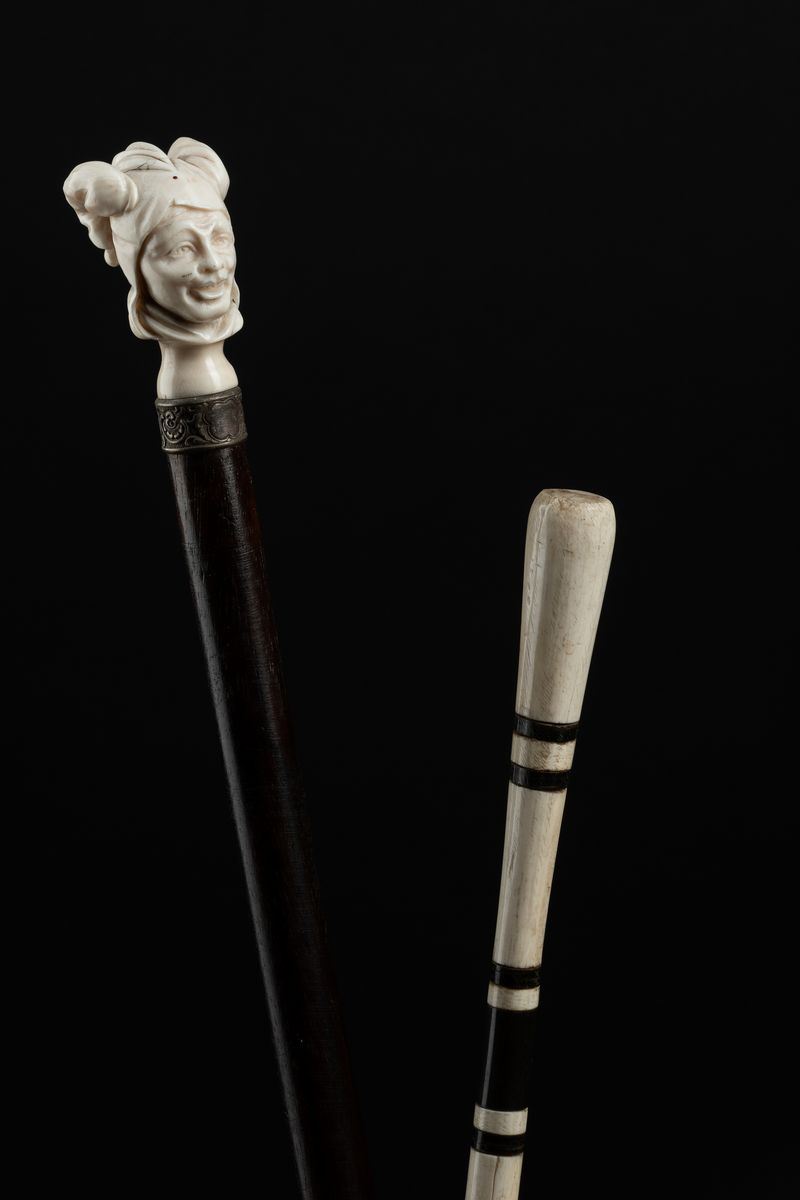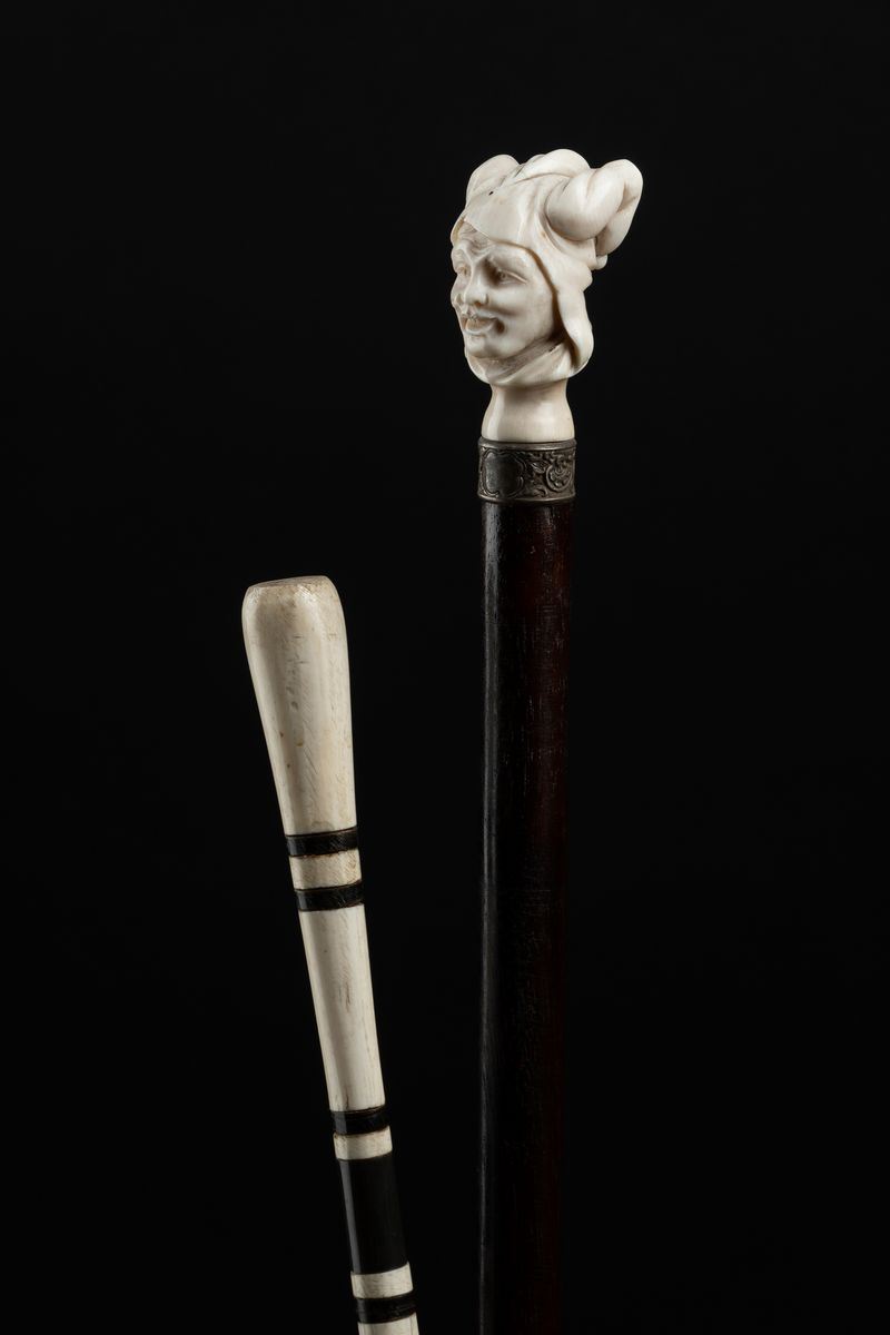- Impugnatura in avorio raffigurante la testa di un personaggio vestito da jolly. Collare in argento cesellato. Asta in legno. Puntale in ferro.