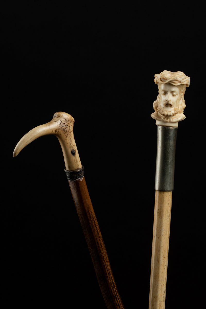 - Impugnatura a pomolo scolpita in resina con testa di Cristo. Asta intera in osso di balena, collarino in metallo.
